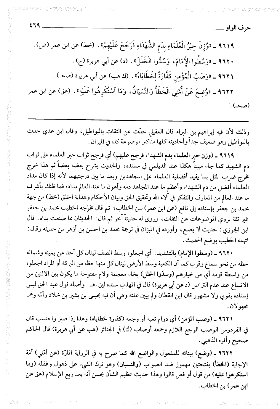 9619 - (وزن حبر العلماء بدم الشهداء فرجح عليهم) أي فرجح ثواب حبر العلماء على ثواب دم الشهيد كما جاء مبينا هكذا عند الديلمي في مسنده ، والحديث يشرح بعضه بعضا ثم هذا خرج مخرج ضرب المثل بما يفيد أفضلية العلماء على المجاهدين وبعد ما بين درجتهما لأنه إذا كان مداد العلماء أفضل من دم الشهداء وأعظم ما عند المجاهد دمه وأهون ما عند العالم مداده فما ظنك بأشرف ما عند العالم من المعارف والتفكر في آلاء الله وتحقيق الحق وبيان الأحكام وهداية الخلق (خط) من جهة محمد بن جعفر بإسناده إلى نافع (عن ابن عمر) بن الخطاب ، ثم قال مخرجه الخطيب : محمد بن جعفر غير ثقة يروي الموضوعات عن الثقات ، وروي له حديثا آخر ثم قال : الحديثان مما صنعت يداه.