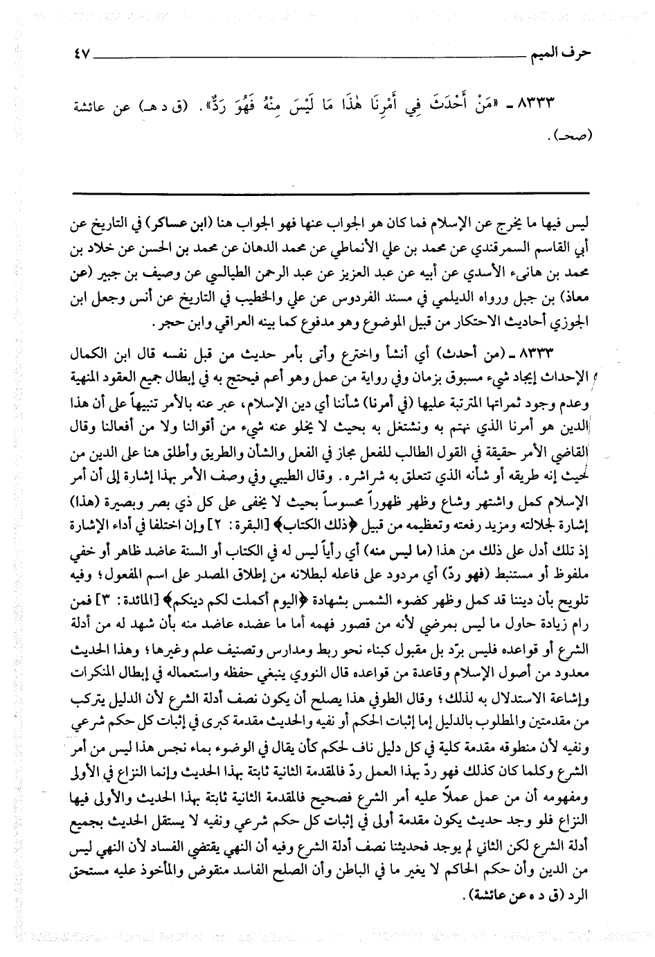 8333 - (من أحدث) أي أنشأ واخترع وأتى بأمر حديث من قبل نفسه قال ابن الكمال : الإحداث إيجاد شئ مسبوق بزمان وفي رواية من عمل وهو أعم فيحتج به في إبطال جميع العقود المنهية وعدم وجود ثمراتها المترتبة عليها (في أمرنا) شأننا أي دين الإسلام ، عبر عنه بالأمر تنبيها على أن هذا الدين هو أمرنا الذي نهتم به ونشتغل به بحيث لا يخلو عنه شئ من أقوالنا ولا من أفعالنا وقال القاضي : الأمر حقيقة في القول الطالب للفعل مجاز في الفعل والشأن والطريق وأطلق هنا على الدين من حيث إنه طريقه أو شأنه الذي تتعلق به شراشره وقال الطيبي : وفي وصف الأمر بهذا إشارة إلى أن أمر الإسلام كمل واشتهر وشاع وظهر ظهورا محسوسا بحيث لا يخفي على كل ذي بصر وبصيرة (هذا) إشارة لجلالته ومزيد رفعته وتعظيمه من قبيل * (ذلك الكتاب) [ البقرة : 2 ] وإن اختلفا في أداء الإشارة إذ تلك أدل على ذلك من هذا (ما ليس منه) أي رأيا ليس له في الكتاب أو السنة عاضد ظاهر أو خفي ملفوظ أو مستنبط (فهو رد) أي مردود على فاعله لبطلانه من إطلاق المصدر على اسم المفعول ، وفيه تلويح بأن ديننا قد كمل وظهر كضوء الشمس بشهادة * (اليوم أكملت لكم دينكم) [ المائدة : 3 ] فمن رام زيادة حاول ما ليس بمرضي لأنه من قصور فهمه أما ما عضده عاضد منه بأن شهد له من أدلة الشرع أو قواعده فليس برد بل مقبول كبناء نحو ربط ومدارس وتصنيف علم وغيرها ، وهذا الحديث معدود من أصول الإسلام وقاعدة من قواعده ، قال النووي : ينبغي حفظه واستعماله في إبطال المنكرات وإشاعة الاستدلال به لذلك ، وقال الطوفي : هذا يصلح أن يكون نصف أدلة الشرع لأن الدليل يتركب من مقدمتين والمطلوب بالدليل إما إثبات الحكم أو نفيه والحديث مقدمة كبرى في إثبات كل حكم شرعي