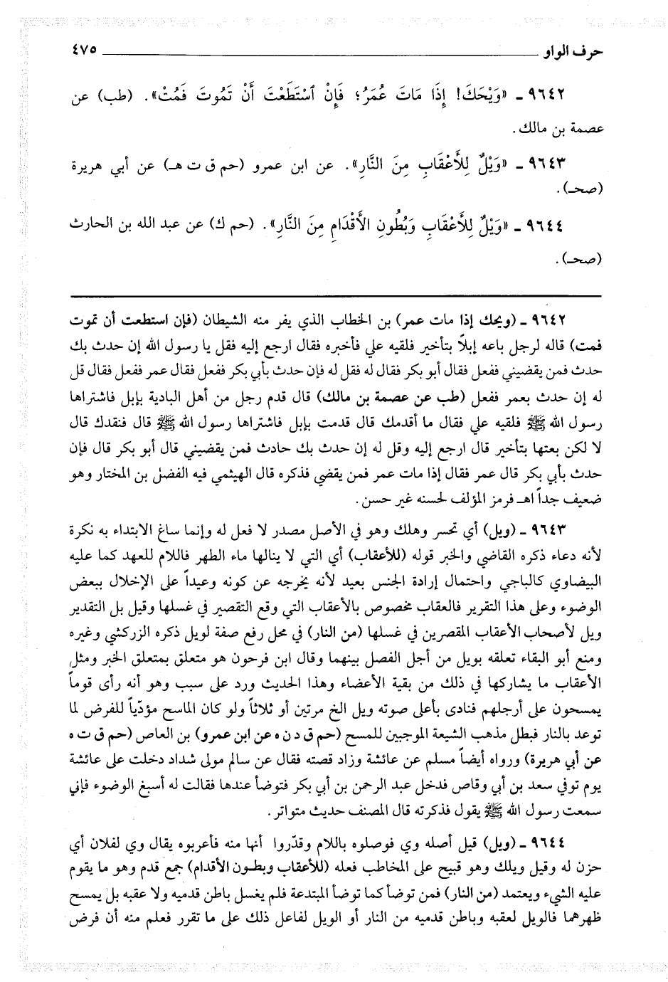 9643 - (ويل) أي تحسر وهلك وهو في الأصل مصدر لا فعل له وإنما ساغ الابتداء به نكرة لأنه دعاء ذكره القاضي والخبر قوله (للأعقاب) أي التي لا ينالها ماء الطهر فاللام للعهد كما عليه البيضاوي كالباحي واحتمال إرادة الجنس بعيد لأنه يخرجه عن كونه وعيدا على الإخلال ببعض الوضوء وعلى هذا التقرير فالعقاب مخصوص بالأعقاب التي وقع التقصير في غسلها وقيل بل التقدير ويل لأصحاب الأعقاب المقصرين في غسلها (من النار) في محل رفع صفة لويل ذكره الزركشي وغيره ومنع أبو البقاء تعلقه بويل من أجل الفصل بينهما وقال ابن فرحون : هو متعلق بمتعلق الخبر ومثل الأعقاب ما يشاركها في ذلك من بقية الأعضاء وهذا الحديث ورد على سبب وهو أنه رأى قوما يمسحون على أرجلهم فنادى بأعلى صوته وبل إلخ مرتين أو ثلاثا ولو كان الماسح مؤديا للفرض لما توعد بالنار فبطل مذهب الشيعة الموجبين للمسح (حم ق د ن ه عن ابن عمرو) بن العاص (حم ق ت ه عن أبي هريرة) ورواه أيضا مسلم عن عائشة وزاد قصته فقال : عن سالم مولى شداد دخلت على عائشة يوم توفي سعد بن أبي وقاص فدخل عبد الرحمن بن أبي بكر فتوضأ عندها فقالت له أسبغ الوضوء فإني سمعت رسول الله صلى الله عليه وسلم يقول فذكرته قال المصنف : حديث متواتر.