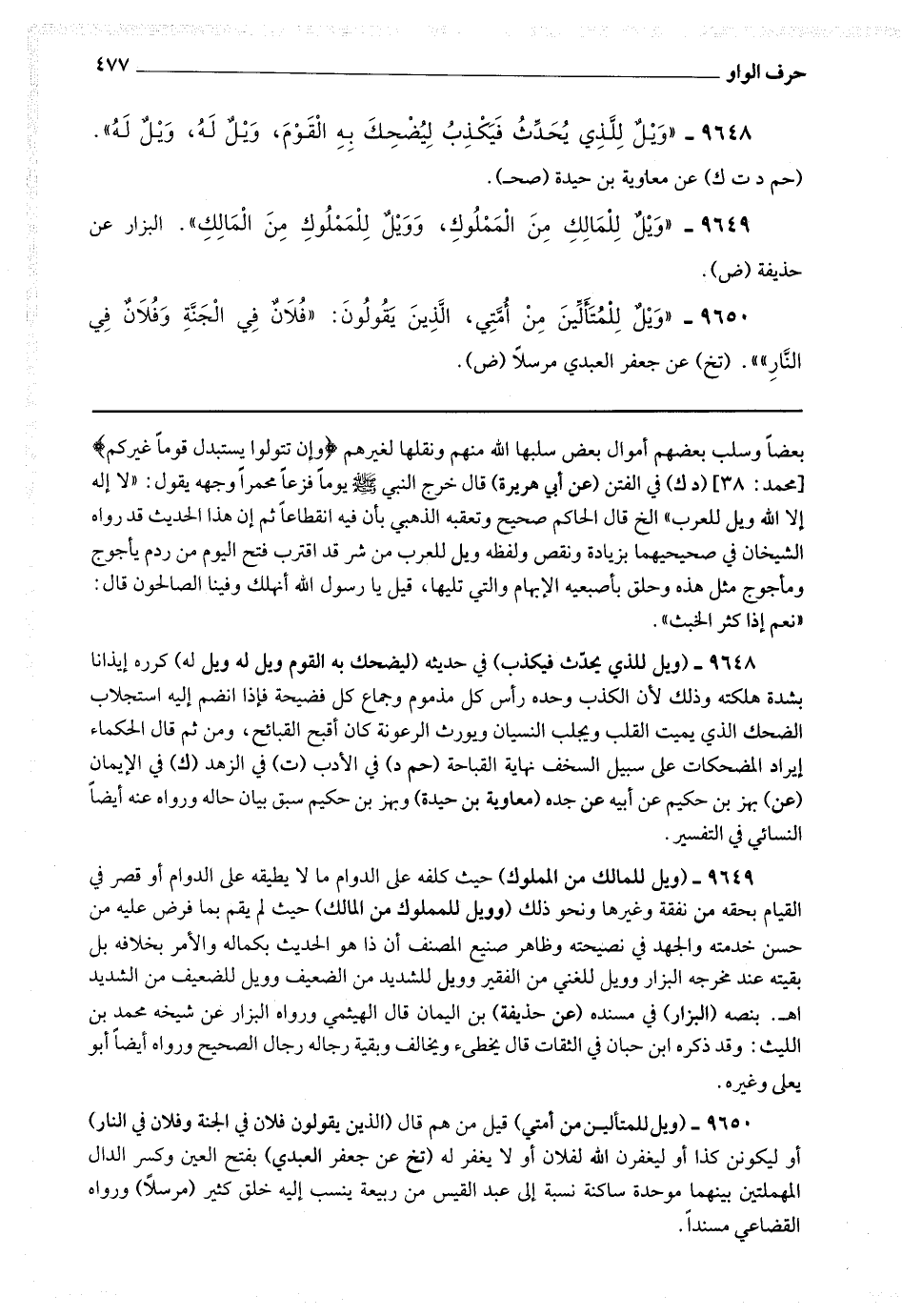 9648 - (ويل للذي يحدث فيكذب) في حديثه (ليضحك به القوم ويل له ويل له) كرره إيذانا بشدة هلكته وذلك لأن الكذب وحده رأس كل مذموم وجماع كل فضيحة فإذا انضم إليه استجلاب الضحك الذي يميت القلب ويجلب النسيان ويورث الرعونة كان أقبح القبائح ، ومن ثم قال الحكماء : إيراد المضحكات على سبيل السخف نهاية القباحة (حم د) في الأدب (ت) في الزهد (ك) في الإيمان (عن) بهز بن حكيم عن أبيه عن جده (معاوية بن حيدة) وبهز بن حكيم سبق بيان حاله ورواه عنه أيضا النسائي في التفسير.
