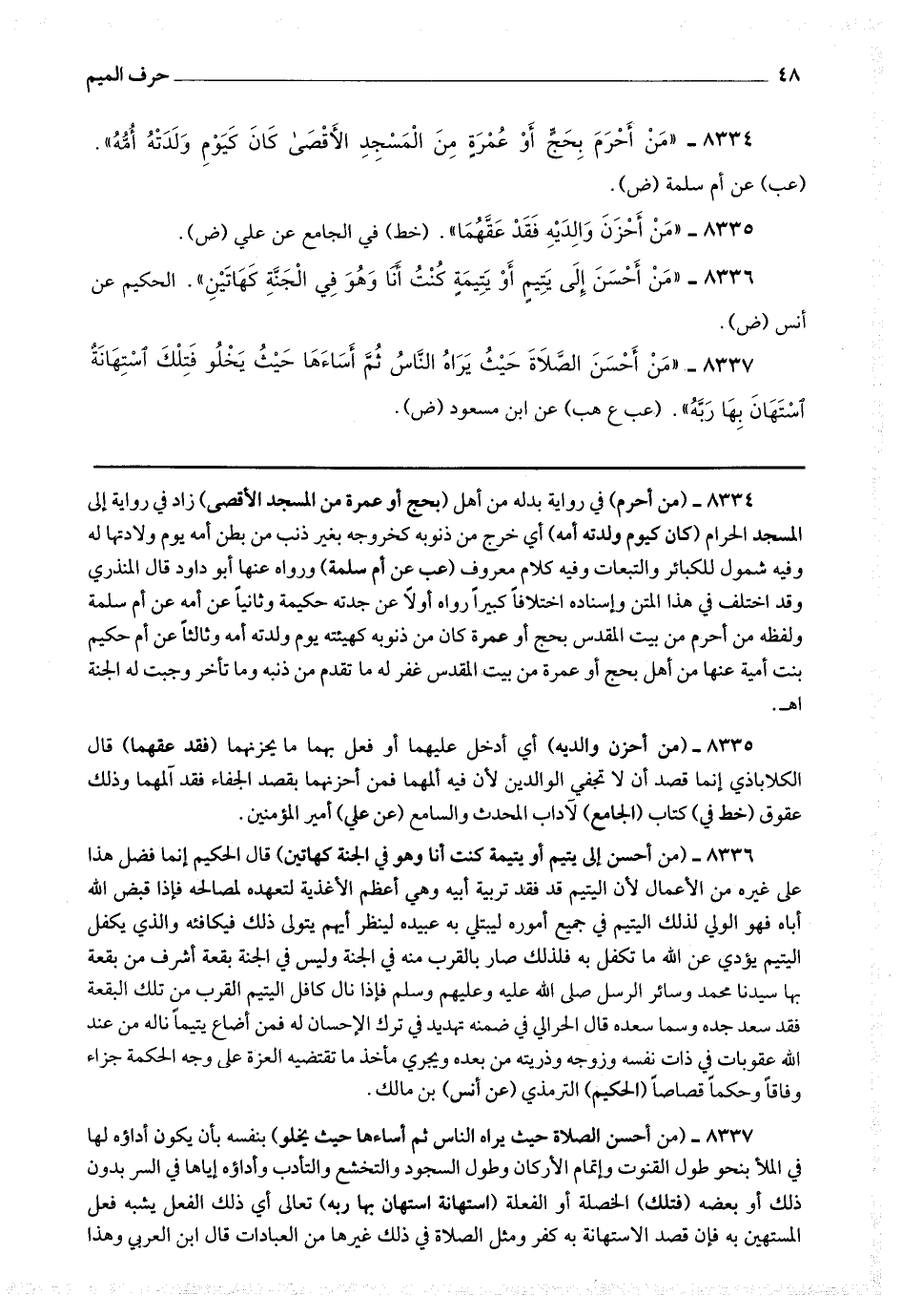 8334 - (من أحرم) في رواية بدله من أهل (بحج أو عمرة من المسجد الأقصى) زاد في رواية إلى المسجد الحرام (كان كيوم ولدته أمه) أي خرج من ذنوبه كخروجه بغير ذنب من بطن أمه يوم ولادتها له وفيه شمول للكبائر والتبعات وفيه كلام معروف.