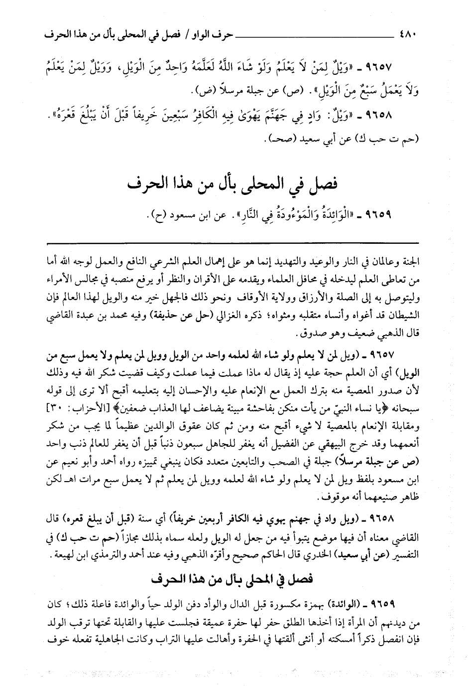 9657 - (ويل لمن لا يعلم ولو شاء الله لعلمه واحد من الويل وويل لمن يعلم ولا يعمل سبع من الويل) أي أن العلم حجة عليه إذ يقال له ماذا عملت فيما علمت وكيف قضيت شكر الله فيه وذلك لأن صدور المعصية منه بترك العمل مع الإنعام عليه والإحسان إليه بتعليمه أقبح ألا ترى إلى قوله