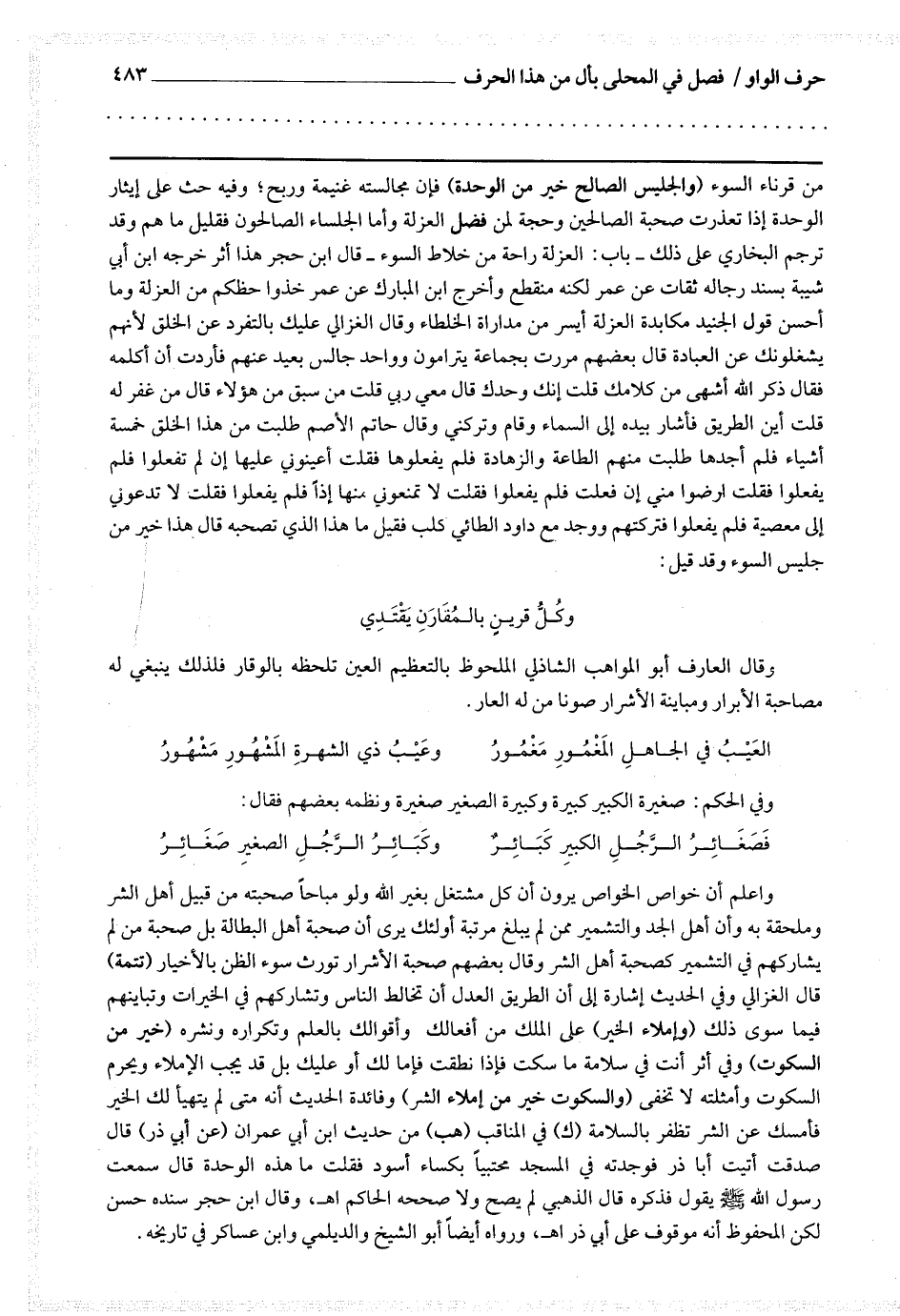 من قرناء السوء (والجليس الصالح خير من الوحدة) فإن مجالسته غنييمة وربح ، وفيه حث على إيثار الوحدة إذا تعذرت صحبة الصالحين وحجة لمن فضل العزلة وأما الجلساء الصالحون فقليل ما هم وقد ترجم البخاري على ذلك - باب العزلة راحة من خلاط السوء - ، قال ابن حجر : هذا أثر خرجه ابن أبي شيبة بسند رجاله ثقات عن عمر لكنه منقطع وأخرج ابن المبارك عن عمر خذوا حظكم من العزلة وما أحسن قول الجنيد : مكابدة العزة أيسر من مداراة الخلطاء ، وقال الغزالي : عليك بالتفرد عن الخلق لأنهم يشغلونك عن العبادة قال بعضهم : مررت بجماعة يترامون وواحد جالس بعيد عنهم فأردت أن أكلمه فقال : ذكر الله أشهى من كلامك قلت : إنك وحدك قال : معي ربي قلت : من سبق من هؤلاء قال : من غفر له قلت : أين الطريق فأشار بيده إلى السماء وقام وتركني وقال حاتم الأصم : طلبت من هذا الخلق خمسة أشياء فلم أجدها طلبت منهم الطاعة والزهادة فلم يفعلوها فقلت : أعينوني عليها إن لم يفعلوا فقلت : ارضوا مني إن فعلت فلم يفعلوا فقلت : لا تمنعوني منها إذا فلم يفعلوا فقلت : لا تدعوني إلى معصية فلم يفعلوا فتركتهم ووجد مع داود الطائي كلب فقيل : ما هذا الذي تصحبه قال : هذا خير من جليس السوء وقد قيل : وكل قرين بالمقارن يقتدي " وقال العارف أبو المواهب الشاذلي : الملحوظ بالتعظيم العين تلحظه بالوقار فلذلك ينبغي له مصاحبة الأبرار ومباينة الأشرار صونا له من العار : العيب في الجاهل المغمور مغمور * وعيب ذي الشهرة المشهور مشهور وفي الحكم : صغيرة الكبير كبيرة وكبيرة الصغير صغيرة ونظمه بعضهم فقال : [ ص 373 ] فصغائر الرجل الكبير كبائر * وكبائر الرجل الصغير صغائر واعلم أن خواص الخواص يرون أن كل مشتغل بغير الله ولو مباحا صحبته من قبيل أهل الشر وملحقة به وأن أهل الجد والتشمير ممن لم يبلغ مرتبة أولئك يرى أن صحبة أهل البطالة بل صحبة من لم يشاركهم في التشمير كصحبة أهل الشر وقال بعضهم : صحبة الأشرار تورث سوء الظن بالأخيار (تتمة) قال الغزالي : وفي الحديث إشارة إلى أن الطريق العدل أن تخالط الناس وتشاركهم في الخيرات وتباينهم