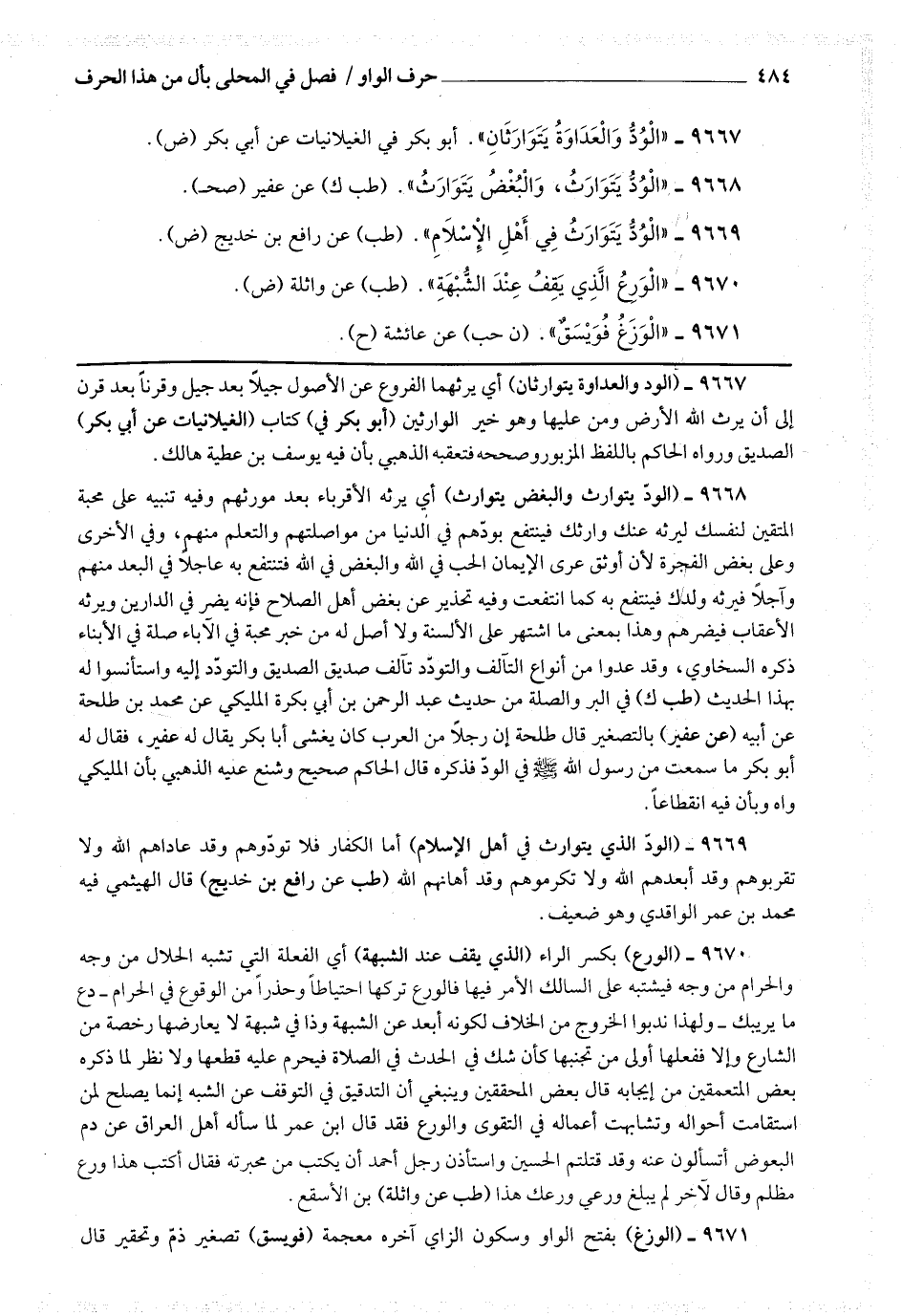 9668 - (الود يتوارث والبغض يتوارث) أي يرثه الأقرباء بعد مورثهم وفيه تنبيه على محبة المتقين لنفسك ليرثه عنك وارثك فينتفع بودهم في الدنيا من مواصلتهم والتعلم منهم ، وفي الأخرى وعلي بغض الفجرة لأن أوثق عرى الإيمان الحب في الله والبغض في الله فتنتفع به عاجلا في البعد منهم وآجلا فيرثه ولدك فينتفع به كما انتفعت وفيه تحذير عن بغض أهل الصلاح فإنه يضر في الدارين ويرثه الأعقاب فيضرهم وهذا بمعنى ما اشتهر على الألسنة ولا أصل له من خبر محبة في الآباء صلة في الأبناء ذكره السخاوي ، وقد عدوا من أنواع التآلف والتودد تآلف صديق الصديق والتودد إليه واستأنسوا له بهذا الحديث (طب ك) في البر والصلة من حديث عبد الرحمن بن أبي بكرة المليكي عن محمد بن طلحة عن أبيه (عن عفير) بالتصغير قال طلحة : إن رجلا من العرب كان يغشى أبا بكر يقال له عفير ، فقال له أبو بكر : ما سمعت من رسول الله صلى الله عليه وسلم في الود فذكره قال الحاكم : صحيح وشنع عليه الذهبي بأن المليكي واه وبأن فيه انقطاعا.