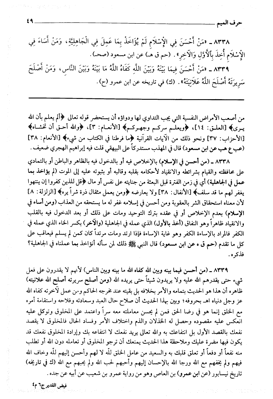 8338 - (من أحسن في الإسلام) بالإخلاص فيه أو بالدخول فيه بالظاهر والباطن أو بالتمادي على محافظته والقيام بشرائطه والانقياد لأحكامه بقلبه وقالبه أو بثبوته عليه إلى الموت (لم يؤاخذ بما عمل في الجاهلية) أي في زمن الفترة قبل البعثة من جنايته على نفس أو مال * (قل للذين كفروا إن ينتهوا يغفر لهم ما قد سلف) [ الانفال : 38 ] ولا يعارضه * (ومن يعمل مثقال ذرة شرا يره) [ الزلزلة : 8 ] لأن معناه استحقاق الشر بالعقوبة ومن أحسن في إسلامه غفر له ما يستحقه من العذاب (ومن أساء في الإسلام) بعدم الإخلاص أو في عقده بترك التوحيد ومات على ذلك أو بعد الدخول فيه بالقلب والانقياد ظاهرا وهو النفاق (أخذ بالأول) الذي عمله في الجاهلية (والآخر) بكسر الخاء الذي عمله في الكفر فالمراد بالإساءة الكفر وهو غاية الإساءة فإذا ارتد ومات مرتدا كان كمن لم يسلم فيعاقب على
