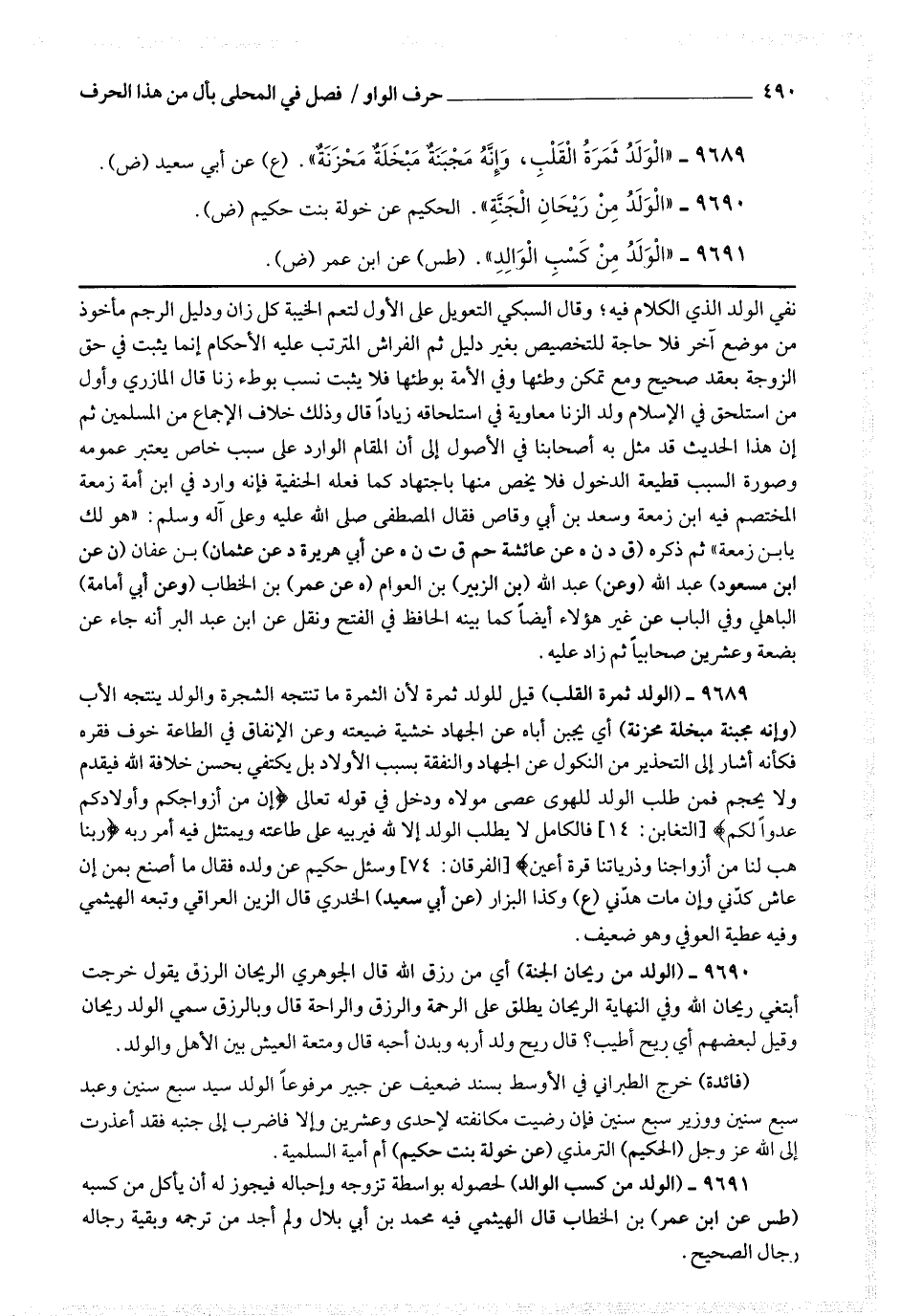 9690 - (الولد من ريحان الجنة) أي من رزق الله ، قال الجوهري : الريحان الرزق يقول خرجت أبتغي ريحان الله وفي النهاية الريحان يطلق على الرحمة والرزق والراحة قال : وبالرزق سمى الولد ريحان وقيل لبعضهم : أي ريح أطيب ؟ قال : ريح ولد أربه وبدن أحبه قال : ومتعة العيش بين الأهل والولد (فائدة) خرج الطبراني في الأوسط بسند ضعيف عن جبير مرفوعا الولد سيد سبع سنين وعبد سبع سنين ووزير سبع سنين فإن رضيت مكانفته لإحدى وعشرين وإلا فاضرب إلى جنبه فقد أعذرت إلى الله عز وجل (الحكيم) الترمذي (عن خولة بنت حكيم) أم أمية السلمية.