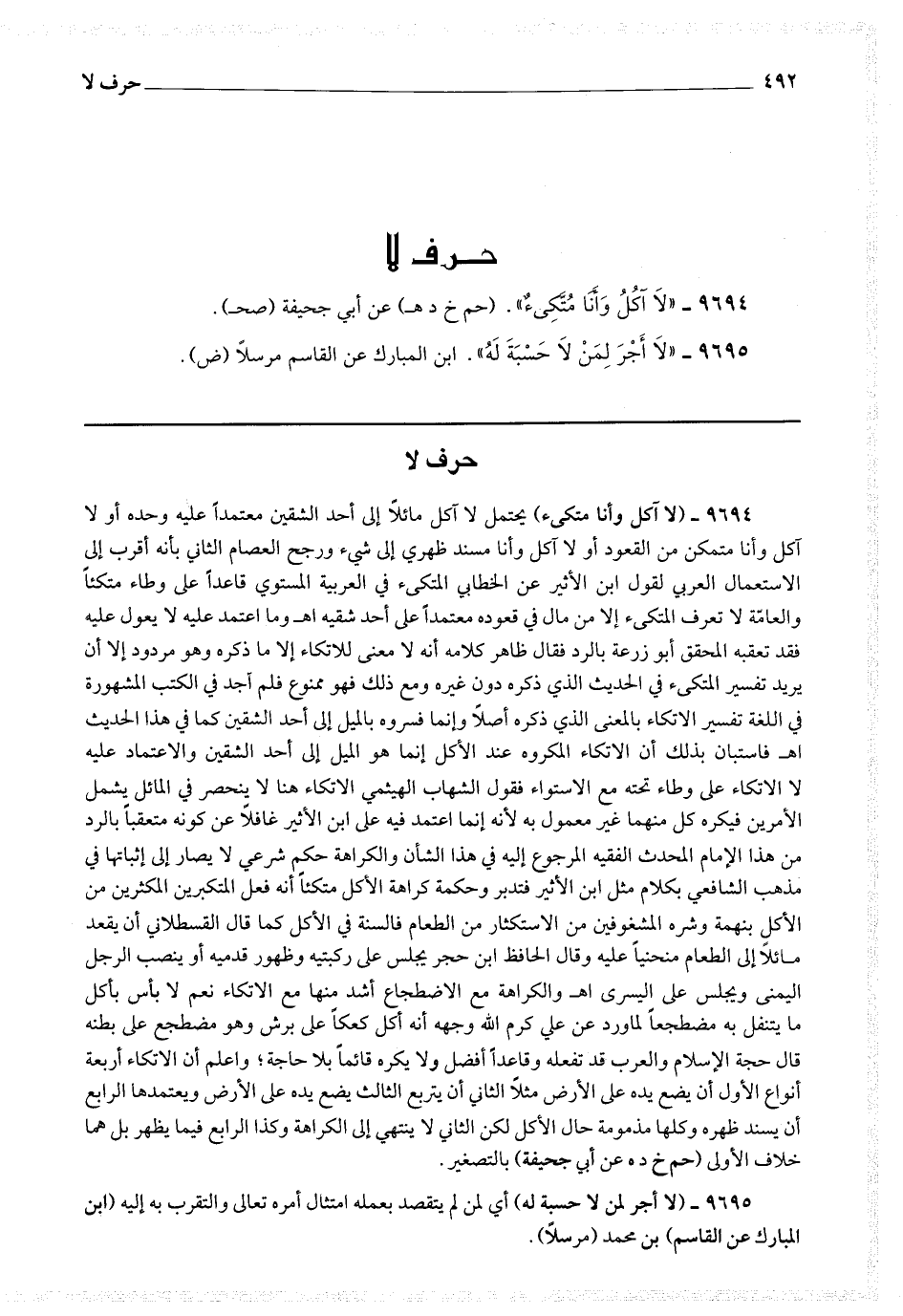 حرف " لا " - 9694 - (لا آكل وأنا متكئ) يحتمل لا آكل مائلا إلى أحد الشقين معتمدا عليه وحده أو لا آكل وأنا متمكن من القعود أو لا آكل وأنا مسند ظهري إلى شئ ورجح العصام الثاني بأنه أقرب إلى الاستعمال العربي لقول ابن الأثير عن الخطابي : المتكئ في العربية المستوي قاعدا على وطاء متكئا والعامة لا تعرف المتكئ إلا من مال في قعوده معتمدا على أحد شقيه اه وما اعتمد عليه لا يعول عليه