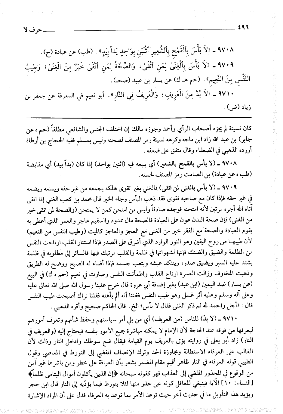 9709 - (لا بأس بالغنى لمن اتقى) فالغنى بغير تقوى هلكة ، يجمعه من غير حقه ويمنعه ويضعه في غير حقه فإذا كان مع صاحبه تقوى فقد ذهب البأس وجاء الخير قال محمد بن كعب : الغني إذا اتقى آتاه الله أجره مرتين لأنه امتحنه فوجده صادقا وليس من امتحن كمن لا يمتحن (والصحة لمن اتقى خير من الغنى) فإن صحة البدن عون على العبادة فالصحة مال ممدود والسقيم عاجز والعمر الذي أعطى به يقوم العبادة والصحة مع الفقر خير من الغنى مع العجز والعاجز كالميت (وطيب النفس من النعيم) لأن طيبها من روح اليقين وهو النور الوارد الذي أشرق على الصدر فإذا استنار القلب ارتاحت النفس من الظلمة والضيق والضنك فإنها لشهواتها في ظلمة والقلب مرتبك فيها فالسائر إلى مطلوبه في ظلمة يشتد عليه السير ويضيق صدره ويتنكد عيشه ويتعب جسمه فإذا أضاء له الصبح ووضح له الطريق وذهبت المخاوف وزالت العسرة ارتاح القلب واطمأنت النفس وصارت في نعيم (حم ه ك) في البيع