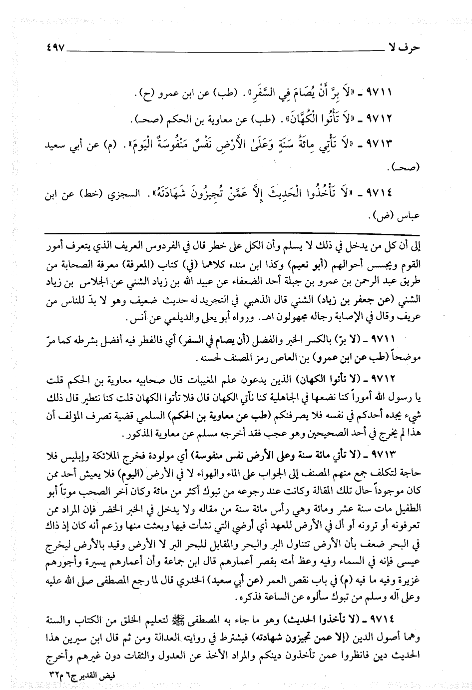 9712 - (لا تأتوا الكهان) الذين يدعون علم المغيبات قال : صحابيه معاوية بن الحكم قلت : يا رسول الله أمورا كنا نضعها في الجاهلية كنا نأتي الكهان قال : فلا تأتوا الكهان قلت : كنا نتطير قال : ذلك شئ يجده أحدكم في نفسه فلا يصرفنكم (طب عن معاوية بن الحكم) السلمي قضية تصرف المؤلف أن