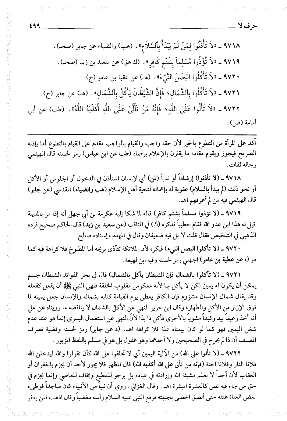 9718 - (لا تأذنوا) إرشادا أو ندبا (لمن) أي لإنسان استأذن في الدخول أو الجلوس أو الأكل أو نحو ذلك (لم يبدأ بالسلام) عقوبة له بإهماله لتحية أهل الإسلام.