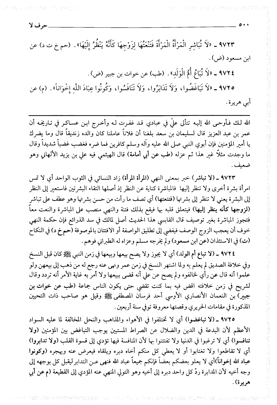 9725 - (لا تباغضوا) أي لا تختلفوا في الأهواء والمذاهب والنحل المخالفة لما عليه السواد الأعظم لأن البدعة في الدين والضلال عن الصراط المستبين يوجب التباغض بين المؤمنين (ولا تنافسوا) أي لا ترغبوا في الدنيا ولا تفتتنوا بها لأن المنافسة فيها تؤدي إلى قسوة القلب (ولا تدابروا) أي لا تقاطعوا ولا تغتابوا أو لا يعطى كل منكم أخاه دبره ويلقاه فيعرض عنه ويهجره (وكونوا عباد الله إخوانا) أي لا يعلو بعضكم بعضا فإنكم جميعا عباد الله فنهى عن التدابر ليقبل كل بوجهه إلى