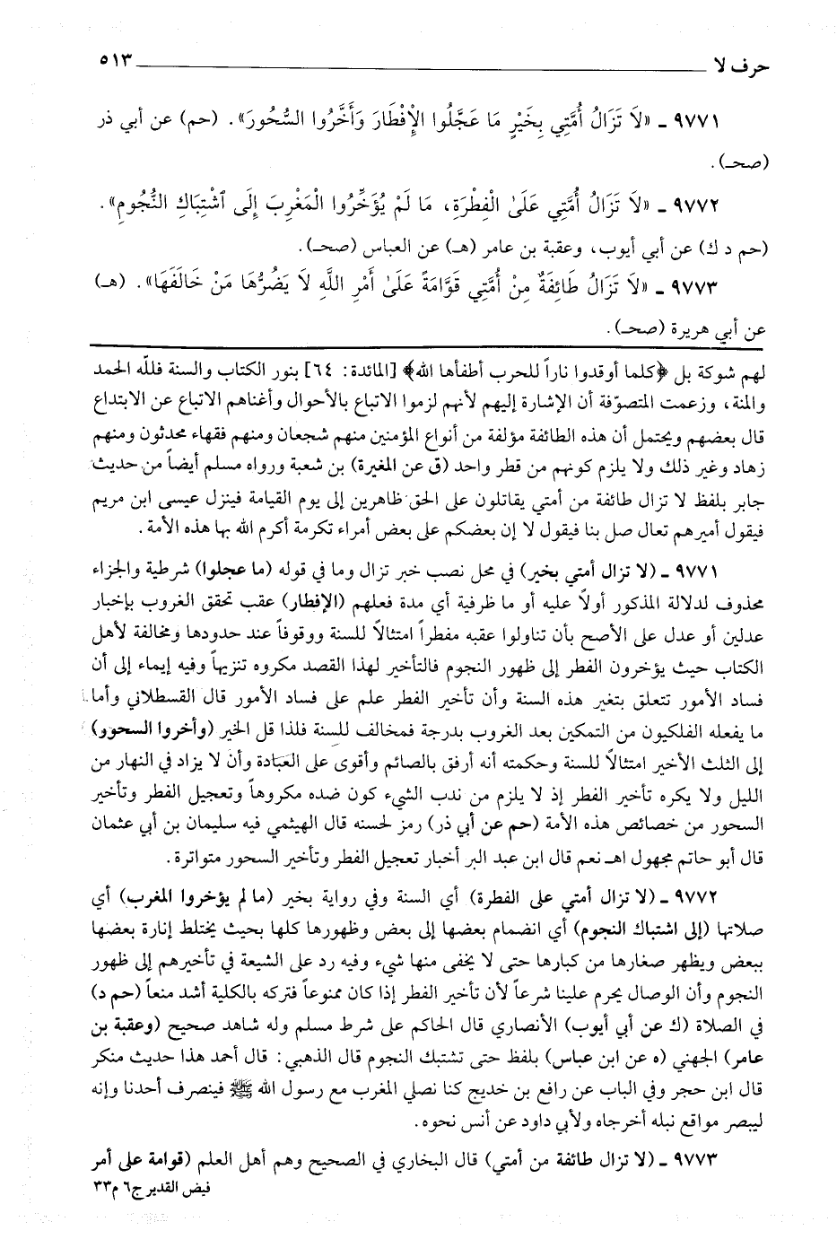 9773 - (لا تزال طائفة من أمتي) قال البخاري في الصحيح وهم أهل العلم (قوامة على أمر