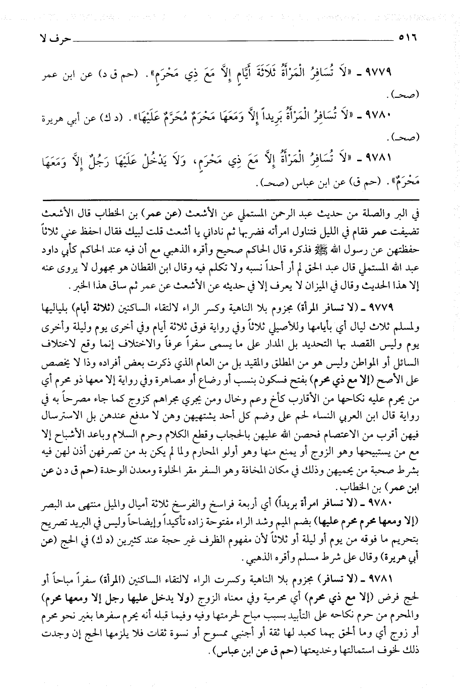 9779 - (لا تسافر المرأة) مجزوم بلا الناهية وكسر الراء لالتقاء الساكنين (ثلاثة أيام) بلياليها