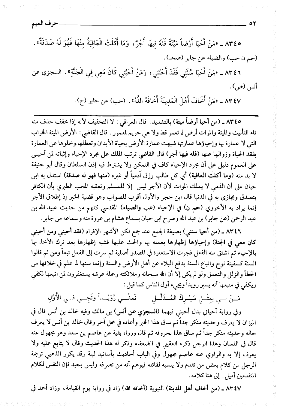8346 - (من أحيا سنني) بصيغة الجمع عند جمع لكن الأشهر الإفراد (فقد أحبني ومن أحبني كان معي في الجنة) وإحياؤها إظهارها بعمله بها والحث عليها فشبه إظهارها بعد ترك الأخذ بها بالإحياء ثم اشتق منه الفعل فجرت الاستعارة في المصدر أصلية ثم سرت إلى الفعل تبعا ومن ثم قالوا : السنة كسفينة نوح واتباع السنة يدفع البلاء عن أهل الأرض والسنة إنما سنها لما علم في خلافها من الخطأ والزلل والتعمق ولو لم يكن إلا أن الله سبحانه وملائكته وحملة عرشه يستغفرون لمن اتبعها لكفى ويكفي في متبعها أنه يسير رويدا ويجئ أول الناس كما قيل : من لي يمثل سيرك المدلل * تمشي رويدا وتجى في الأول وفي رواية أحياني بدل أحبني فيهما.