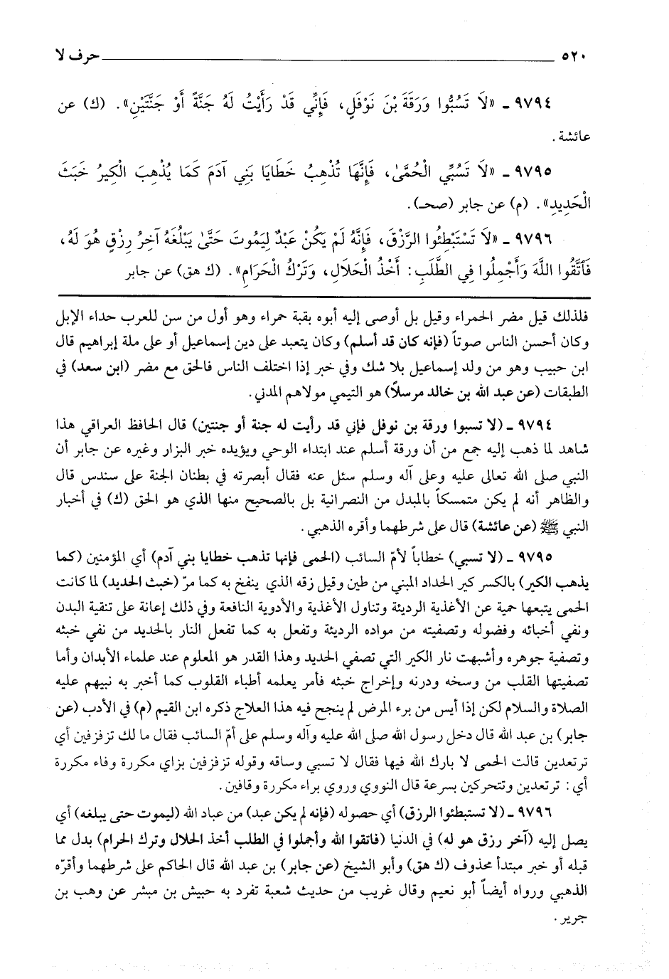 تصفيتها القلب من وسخه ودرنه وإخراج خبثه فأمر يعلمه أطباء القلوب كما أخبر به نبيهم عليه الصلاة والسلام لكن إذا أيس من برء المرض لم ينجح فيه هذا العلاج ذكره ابن القيم (م) في الأدب (عن جابر) بن عبد الله قال : قال : دخل رسول الله صلى الله عليه وآله وسلم على أم السائب فقال : ما لك تزفزفين أي ترتعدين قالت : الحمى لا بارك الله فيها فال : لا تسبي وساقه وقوله تزفزفين بزاي مكررة وفاء مكررة أي : ترتعدين وتتحركين بسرعة قال النووي : وروي براء مكررة وقافين.
