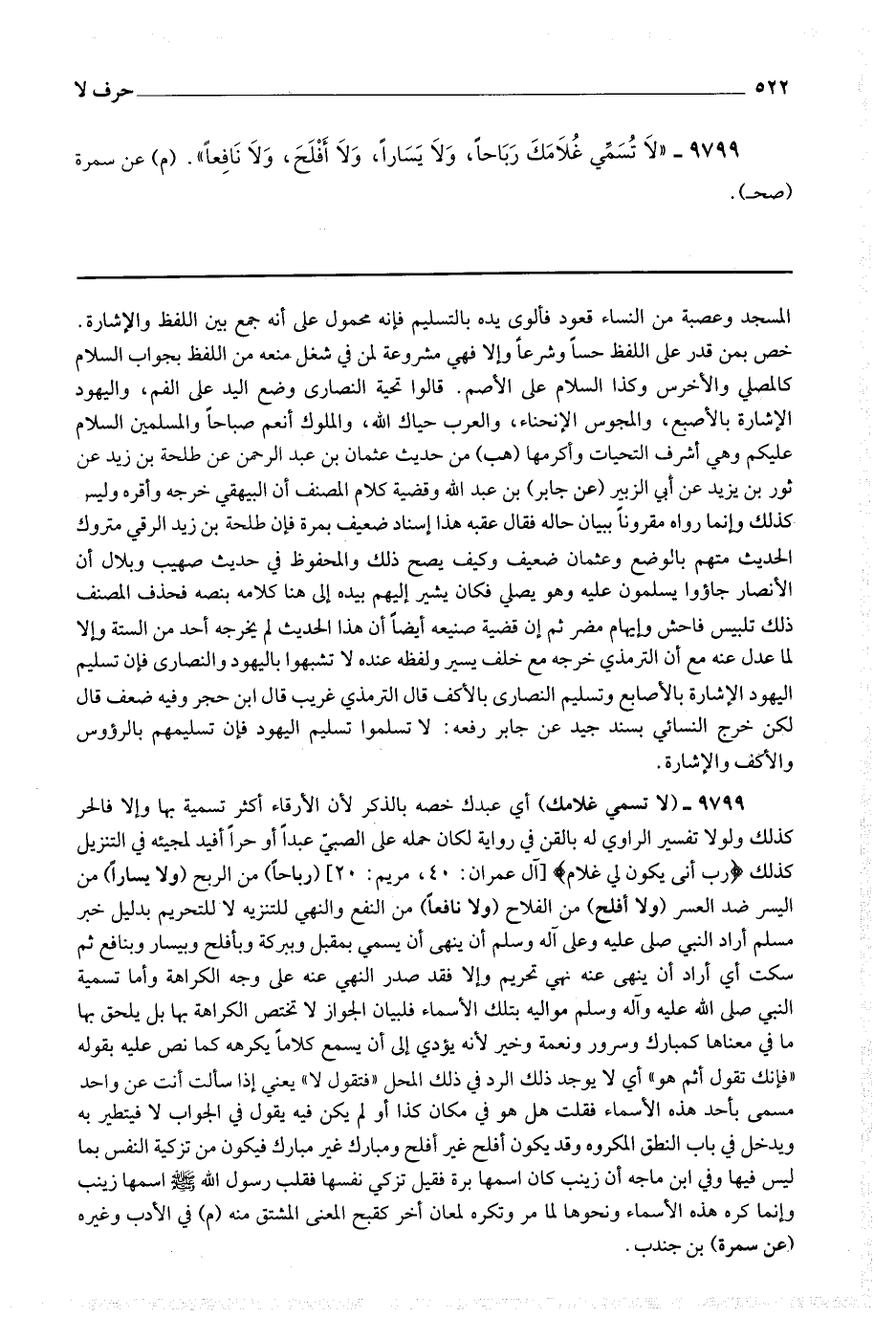 9799 - (لا تسمي غلامك) أي عبدك خصه بالذكر لأن الأرقاء أكثر تسمية بها وإلا فالحر كذلك ولولا تفسير الراوي له بالقن في رواية لكان حمله على الصبي عبدا أو حرا أفيد لمجيئه في التنزيل كذلك * (رب أنى يكون لي غلام) * (رباحا) من الربح (ولا يسارا) من اليسر ضد العسر (ولا أفلح) من الفلاح (ولا نافعا) من النفع والنهي للتنزيه لا للتحريم بدليل خبر مسلم أراد النبي صلى الله عليه وعلى آله وسلم أن ينهي أن يسمى بمقبل وببركة وبأفلح وبيسار وبنافع ثم سكت أي أراد أن ينهى عنه نهي تحريم وإلا فقد صدر النهي عنه على وجه الكراهة وأما تسمية النبي صلى الله [ ص 403 ] عليه وآله وسلم مواليه بتلك الأسماء فلبيان الجواز لا تختص الكراهة بها بل يلحق بها ما في معناها كمبارك وسرور ونعمة وخير لأنه يؤدي إلى أن يسمع كلاما يكرهه كما نص عليه بقوله (فانك تقوم أثم هو) أي لا يوجد ذلك الرد في ذلك المحل (فتقول لا) يعني إذا سألت أنت عن واحد مسمى بأحد هذه الأسماء فقلت : هل هو في مكان كذا أو لم يكن فيه يقول في الجواب لا فيتطير به ويدخل في باب النطق المكروه وقد يكون أفلح غير أفلح ومبارك غير مبارك فيكون من تزكية النفس بما ليس فيها وفي ابن ماجه أن زينب كان اسمها برة فقيل تزكي نفسها فقلب رسول الله صلى الله عليه وسلم اسمها زينب وإنما كره هذه الأسماء ونحوها لما مر وتكره لمعان أخر كقبح المعنى المشتق منه (م) في الأدب وغيره