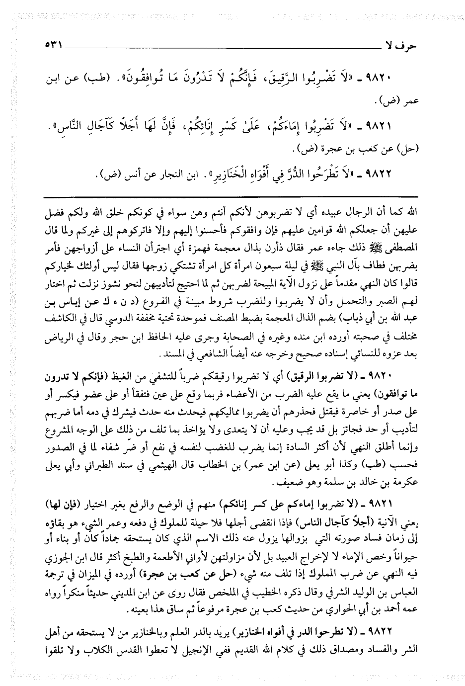 9820 - (لا تضربوا الرقيق) أي لا تضربوا رقيقكم ضربا للتشفي من الغيظ (فإنكم لا تدرون ما توافقون) يعني ما يقع عليه الضرب من الأعضاء فربما وقع على عين فتفقأ أو على عضو فيكسر أو على صدر أو خاصرة فيقتل فحذرهم أن يضربوا مماليكهم فيحدث منه حدث فيشرك في دمه أما ضربهم لتأديب أو حد فجائز بل قد يجب وعليه أن لا يتعدى ولا يؤاخذ بما تلف من ذلك على الوجه المشروع