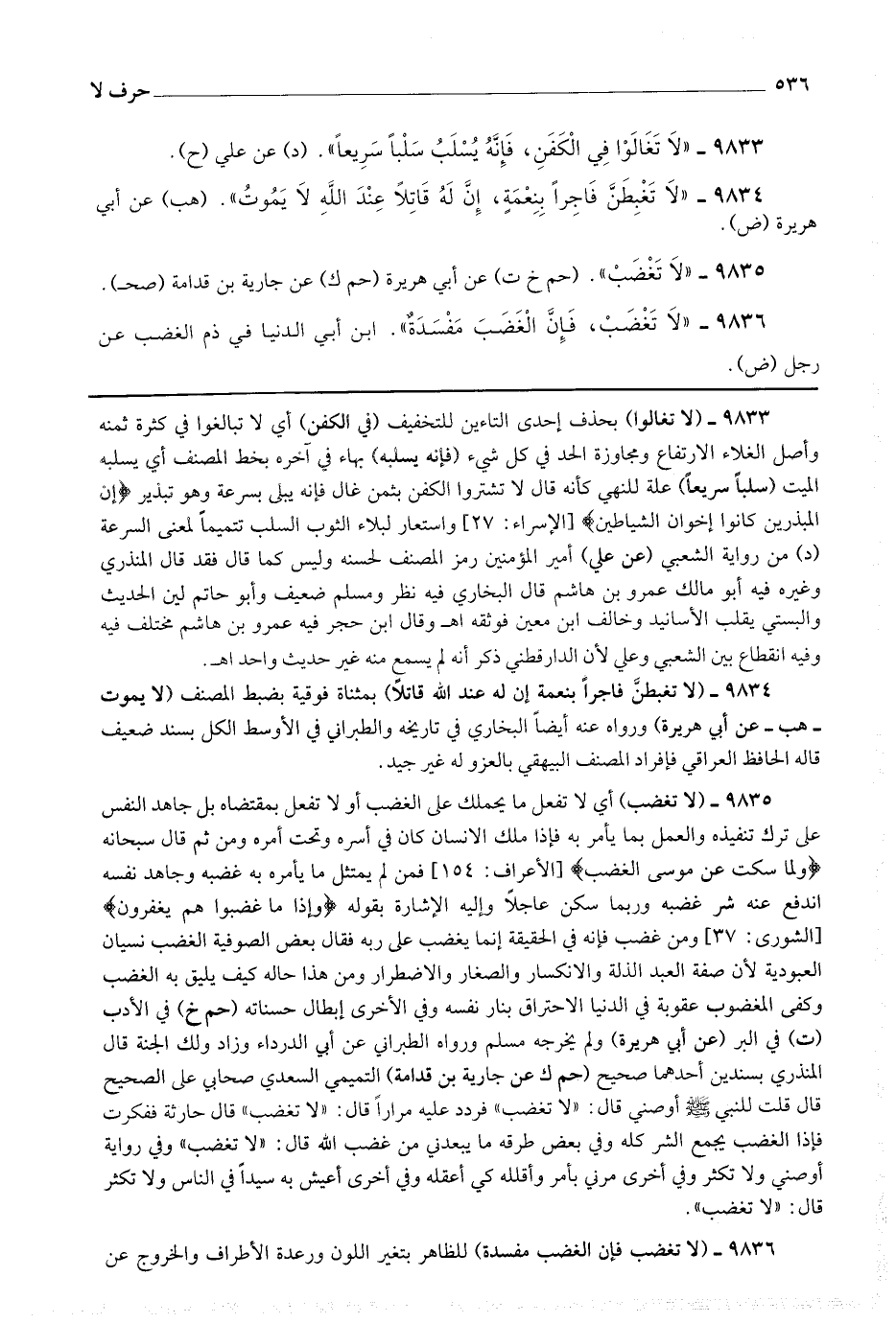 9835 - (لا تغضب) أي لا تفعل ما يحملك على الغضب أو لا تفعل بمقتضاه بل جاهد النفس على ترك تنفيذه والعمل بما يأمر به فإذا ملك الإنسان كان في أسره وتحت أمره ومن ثم قال سبحانه * (ولما سكت عن موسى الغضب) * فمن لم يمتثل ما يأمر به غضبه وجاهد نفسه اندفع عنه شر غضبه وربما سكن عاجلا وإليه الإشارة بقوله * (وإذا ما غضبوا هم يغفرون) * [ الشورى : 37 ] ومن غضب فإن في الحقيقة إنما يغضب على ربه فقال بعض الصوفية : الغضب نسيان العبودية لأن صفة العبد الذلة والانكسار والصغار والاضطرار ومن هذا حاله كيف يليق به الغضب وكفى المغضوب عقوبة في الدنيا [ ص 414 ] الاحتراق بنار نفسه وفي الأخرى إبطال حسناته.
