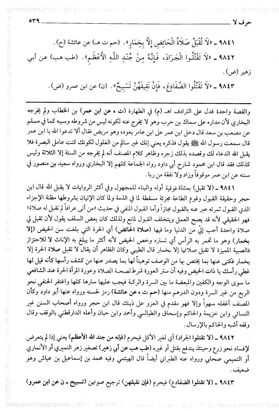 9843 - (لا تقتلوا الضفادع) فيحرم (فإن نقيقهن) ترجيع صوتهن (تسبيح) (ن عن ابن عمرو)