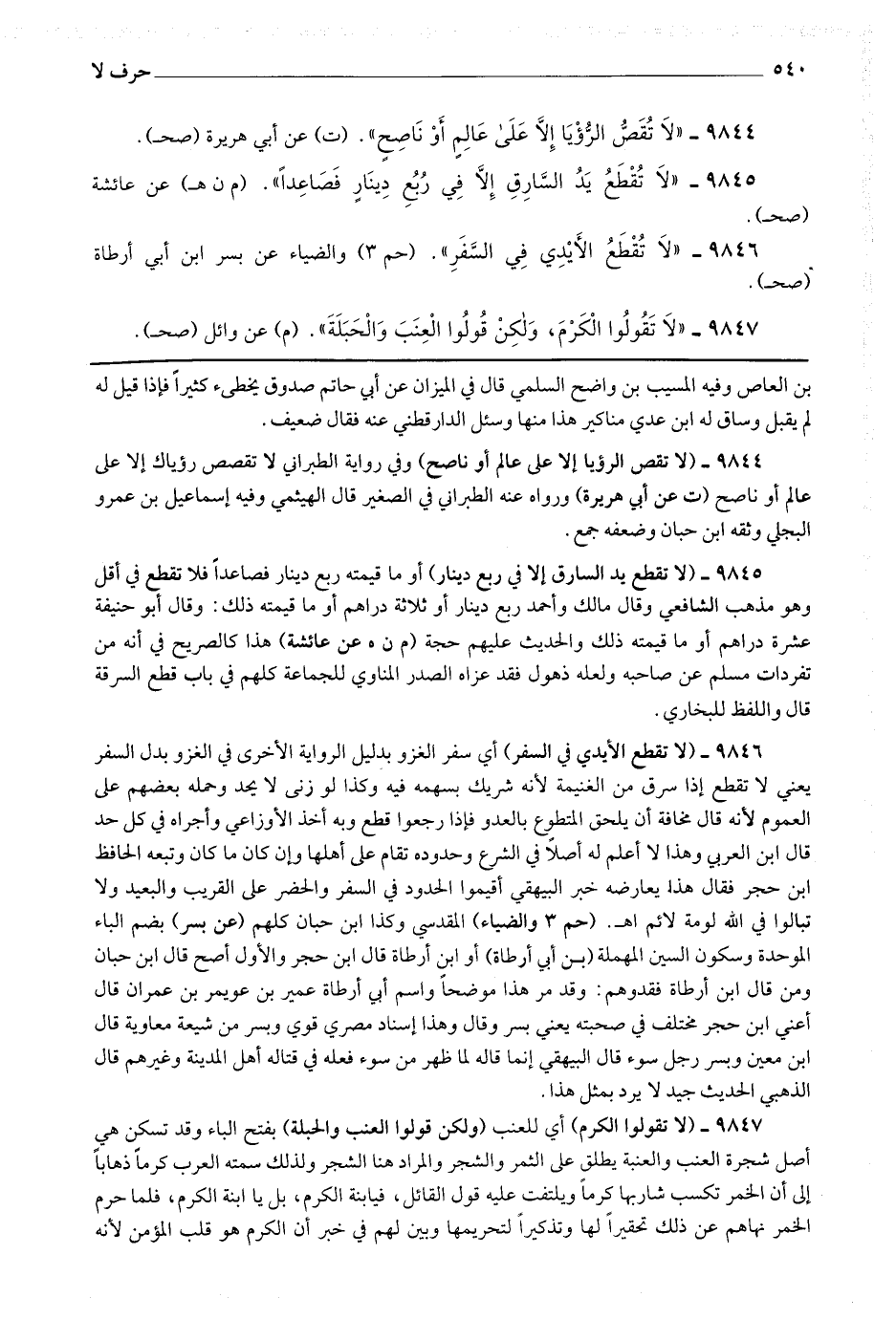 9847 - (لا تقولوا الكرم) أي للعنب (ولكن قولوا العنب والحبلة) بفتح الباء وقد تسكن هي أصل شجرة العنب والعنبة يطلق على الثمر والشجر والمراد هنا الشجر ولذلك سمته العرب كرما ذهابا