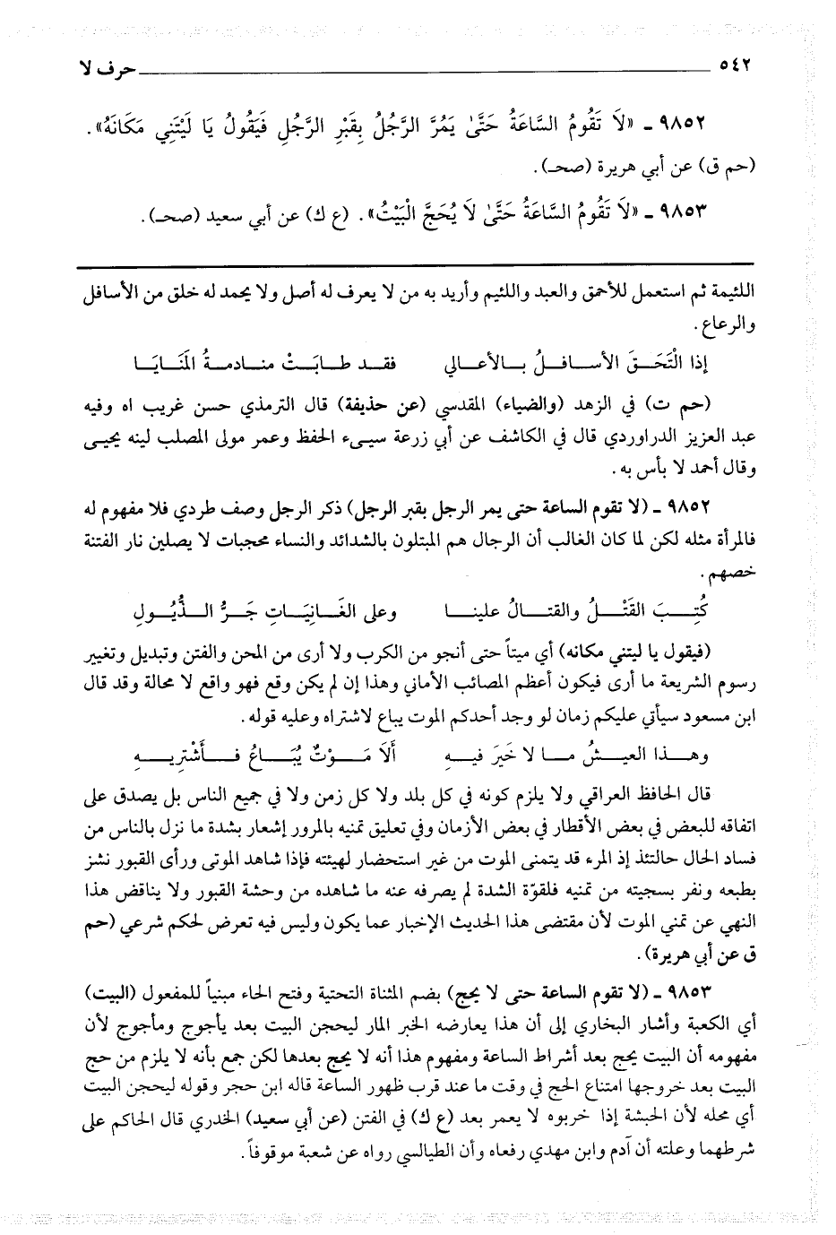 9853 - (لا تقوم الساعة حتى لا يحج) بضم المثناة التحتية وفتح الحاء مبنيا للمفعول (البيت) أي الكعبة وأشار البخاري إلى أن هذا يعارضه الخبر المار ليحجن البيت بعد يأجوج ومأجوج لأن مفهومه أن البيت يحج بعد أشراط الساعة ومفهوم هذا أنه لا يحج بعدها لكن جمع بأنه لا يلزم من حج البيت بعد خروجها امتناع الحج في وقت ما عند قرب ظهور الساعة قاله ابن حجر وقوله ليحجن البيت أي محله لأن الحبشة إذا خربوه لا يعمر بعد (ع ك) في الفتن (عن أبي سعيد) الخدري قال الحاكم : على شرطهما وعلته أن آدم وابن مهدي رفعاه وأن الطيالسي رواه عن شعبة موقوفا.