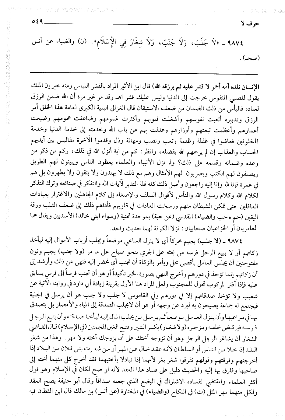 9874 - (لا جلب) بجيم محركا أي لا ينزل الساعي موضعا ويجلب أرباب الأموال إليه ليأخذ زكاتهم أو لا يبيع الرجل فرسه من يحثه على الجري بنحو صياح على ما مر (ولا جنب) بجيم ونون مفتوحتين أن يجلس العامل بأقصى محل ويأمر بالزكاة أن تجنب أي تحضر إليه فنهى عن ذلك وأرشد إلى أن زكاتهم إنما تؤخذ في دورهم وأخرج النهي [ ص 424 ] بصورة الخبر تأكيدا أو هو أن تجنب فرسا إلى فرس يسابق عليه فإذا أفتر المركوب تحول للجنوب ولعل المراد هنا الأول بقرينة زيادة أبي داود في روايته الآتية عن شعيب ولا تؤخذ صدقاتهم إلا في دورهم وفي القاموس لا جلب ولا جنب هو أن يرسل في الجلبة فيجتمع له جماعة يصيحون به ليرد عن وجهه أو هو أن لا يجلب الصدقة إلى المياه والأمصار بل يتصدق بها في مراعيها وأن ينزل العامل موضعا ثم يرسل من يجلب المال إليه ليأخذ صدقته وأن يتبع الرجل فرسه فيركض خلفه ويزجره (ولا شغار) بكسر الشين وفتح الغين المعجمتين (في الإسلام) قال القاضي : الشغار أن يشاغر الرجل الرجل وهو أن تزوجه أختك على أن يزوجك أخته ولا مهر.