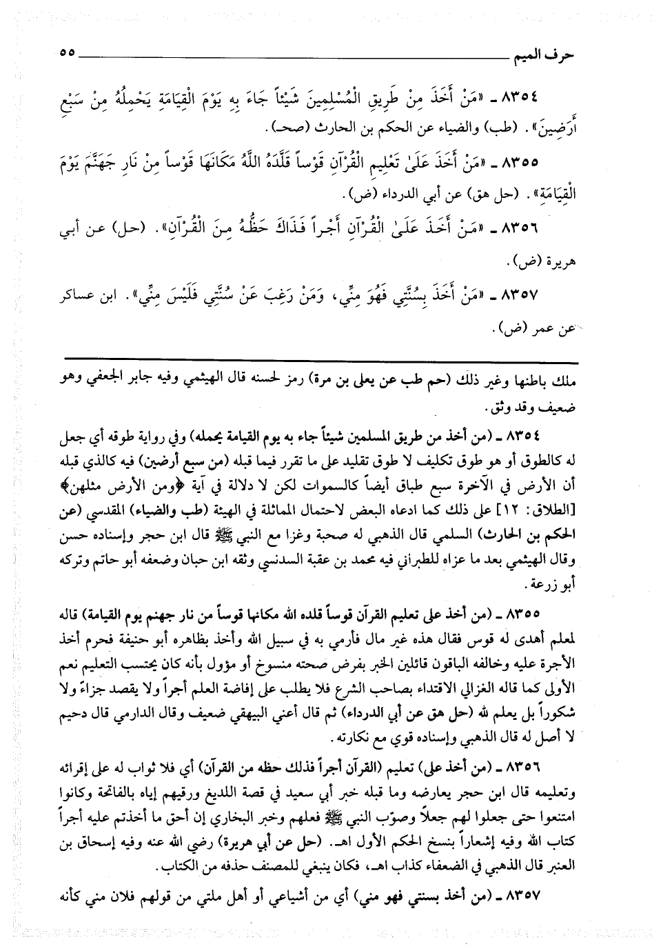 8355 - (من أخذ على تعليم القرآن قوسا قلده الله مكانها قوسا من نار جهنم يوم القيامة) قاله لمعلم أهدى له قوس فقال : هذه غير مال فأرمى به في سبيل الله ، وأخذ بظاهره أبو حنيفة فحرم أخذ الأجرة عليه وخالفه الباقون قائلين الخبر بفرض صحته منسوخ أو مؤول بأنه كان يحتسب التعليم.