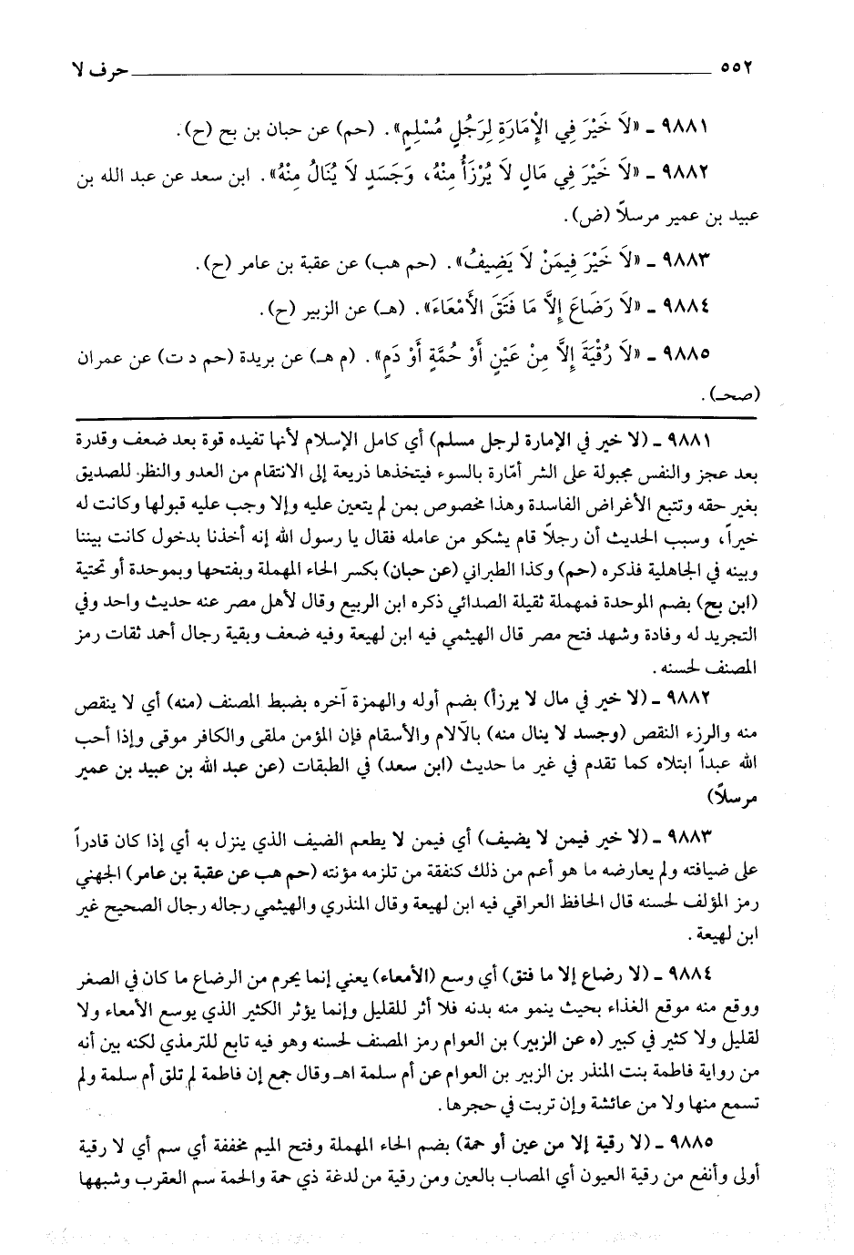 9885 - (لا رقية إلا من عين أو حمة) بضم الحاء المهملة وفتح الميم مخففة أي سم أي لا رقية أولى وأنفع من رقية العيون أي المصاب بالعين ومن رقية من لدغة ذي حمة والحمة سم العقرب وشبهها وقيل فوعة السم