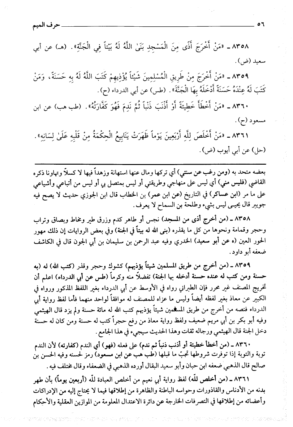 8358 - (من أخرج أذى من المسجد) نجس أو طاهر كدم وزرق طير ومخاط وبصاق وتراب وحجر وقمامة ونحوها من كل ما يقذره (بنى الله له بيتا في الجنة) وفي بعض الروايات إن ذلك مهور الحور العين.