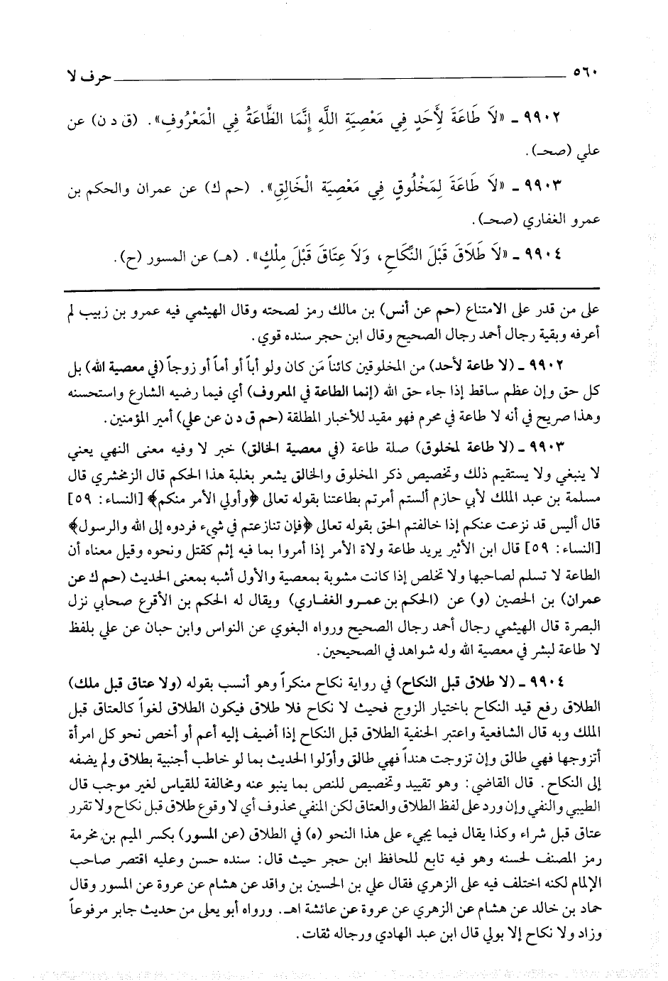 9903 - (لا طاعة لمخلوق) صلة طاعة (في معصية الخالق) خبر لا وفيه معنى النهي يعني