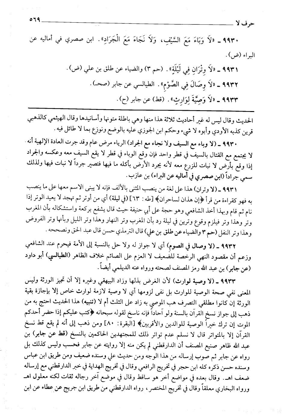 9933 - (لا وصية لوارث) لأن الغرض بذلها وزاد البيهقي وغيره إلا أن تجيز الورثة وليس المعنى نفي صحة الوصية للوارث بل نفي لزومها أي ولا صية لازمة لوارث خاص إلا بإجازة بقية الورثة إن كانوا مطلقي التصرف هب الموصى به زاد على الثلث أم لا (تنبيه) هذا الحديث احتج به من ذهب إلى جواز نسخ القرآن بالسنة ولو آحاد فإنه ناسخ لقوله سبحانه * (كتب عليكم إذا حضر أحدكم الموت إن ترك خيرا الوصية للوالدين والأقربين) * ومن ذهب إلى أنه لم يقع قط نسخ القرآن إلا بالمتواتر قال : لا نسلم عدم تواتر ذلك للمجتهدين الحاكمين بالنسخ.