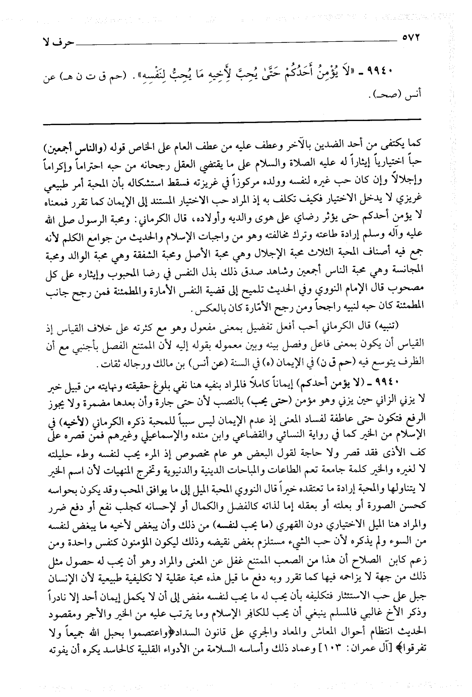 9940 - (لا يؤمن أحدكم) إيمانا كاملا فالمراد بنفيه هنا نفي بلوغ حقيقته ونهايته من قبيل خبر لا يزني الزاني حين يزني وهو مؤمن (حتى يحب) بالنصب لأن حتى جارة وأن بعدها مضمرة ولا يجوز