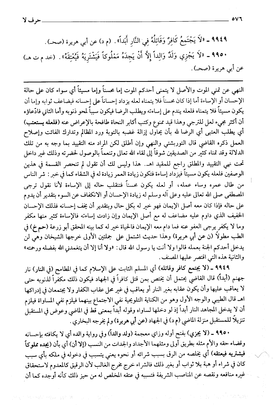 9950 - (لا يجزي) بفتح أوله وزاي معجمة (ولد والدا) وفي رواية والده أي لا يكافئه بإحسانه وقضاء حقه والأم مثله بطريق أولى ومثلهما الأجداد والجدات من النسب (إلا أن) أي بأن (يجده مملوكا فيشتريه فيعتقه) أي يخلصه من الرق بسبب شرائه أو نحوه يعني يتسبب في دخوله في ملكه بأي سبب كان في شراء أو هبة بلا ثواب أو بغير ذلك فالشراء خرج مخرج الغالب لأن الرقيق كالمعدوم لاستحقاق غيره منافعه ونقصه عن المناصب الشريفة فتسببه في عتقه المخلص له من حيز ذلك كأنه أوجده كما أن