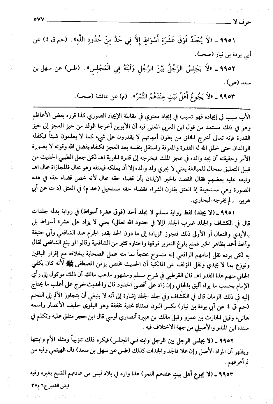 9951 - (لا يجلد) لفظ رواية مسلم لا يجلد أحد (فوق عشرة أسواط) في رواية بدله جلدات قال في الكشاف : والجلد ضرب الجلد (إلا في حدود الله تعالى) يعني لا يزاد على عشرة أسواط بل بالأيدي والنعال أو الأولى ذلك فتجوز الزيادة إلى ما دون الحد بقدر الجرم عند الشافعي وأبي حنيفة وأخذ أحمد بظاهر الخبر فمنع بلوغ التعزير فوقها واختاره كثير من الشافعية وقالوا لو بلغ الشافعي لقال به لكن يرده نقل إمامهم الرافعي إنه منسوخ محتجا بما منه عمل الصحابة بخلافه مع إقرار الباقين ونوزع بما لا يجدي ونقل المؤلف عن المالكية أن الحديث مختص بزمن المصطفى صلى الله عليه وسلم لأنه كان يكفي الجاني منهم هذا القدر اه.