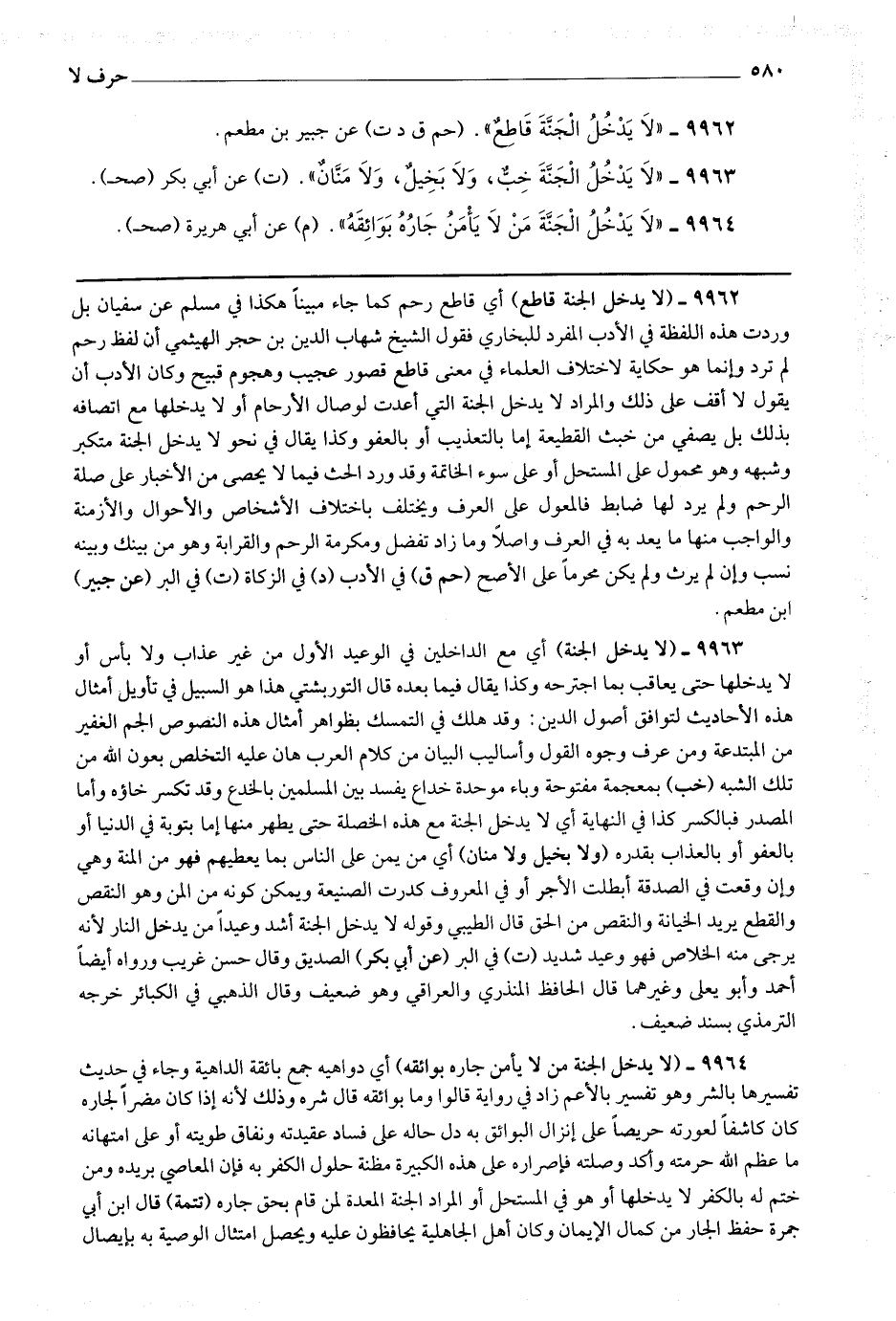 9962 - (لا يدخل الجنة قاطع) أي قاطع رحم كما جاء مبينا هكذا في مسلم عن سفيان بل وردت هذه اللفظة في الأدب المفرد للبخاري فقول الشيخ شهاب الدين ابن حجر الهيثمي أن لفظ رحم لم ترد وإنما هو حكاية لاختلاف العلماء في معنى قاطع قصور عجيب وهجوم قبيح وكان الأدب أن يقول لا أقف على ذلك والمراد لا يدخل الجنة التي أعدت لوصال الأرحام أو لا يدخلها مع اتصافه بذلك بل يصفي من خبث القطيعة إما بالتعذيب أو بالعفو وكذا يقال في نحو لا يدخل الجنة متكبر وشبهه وهو محمول على المستحل أو على سوء الخاتمة وقد ورد الحث فيما لا يحصى من الأخبار على صلة الرحم ولم يرد لها ضابط فالمعول على العرف ويختلف باختلاف الأشخاص والأحوال والأزمنة والواجب منها ما يعد به في العرف واصلا وما زاد تفضل ومكرمة الرحم والقرابة وهو من بينك وبينه نسب وإن لم يرث ولم يكن محرما على الأصح (حم ق) في الأدب (د) في الزكاة (ت) في البر (عن جبير) بن مطعم.