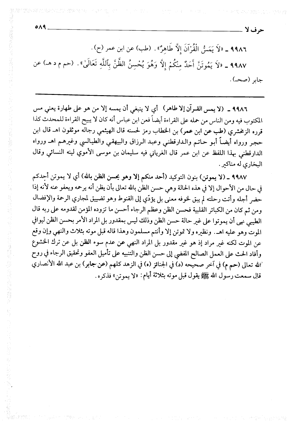 9987 - (لا يموتن) بنون التوكيد (أحد منكم إلا وهو يحسن الظن بالله) أي لا يموتن أحدكم في حال من الأحوال إلا في هذه الحالة وهي حسن الظن بالله تعالى بأن يظن أنه يرحمه ويعفو عنه لأنه إذا