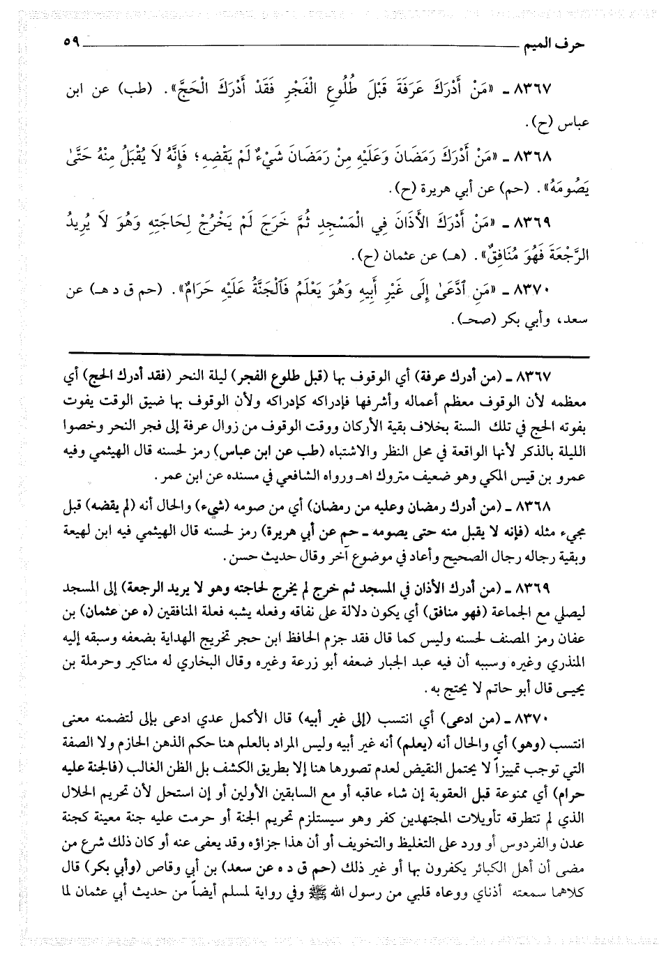 8367 - (من أدرك عرفة) أي الوقوف بها (قبل طلوع الفجر) ليلة النحر (فقد أدرك الحج) أي معظمه ، لأن الوقوف معظم أعماله وأشرفها فإدراكه كإدراكه ، ولأن الوقوف بها ضيق الوقت يفوت بفوته الحج في تلك السنة بخلاف بقية الأركان ، ووقت الوقوف من زوال عرفة إلى فجر النحر ، وخصوا الليلة بالذكر لأنها الواقعة في محل النظر والاشتباه.