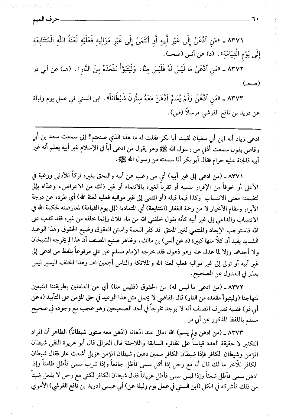 8371 - (من ادعى إلى غير أبيه) أي من رغب عن أبيه والتحق بغيره تركا للأدنى ورغبة في