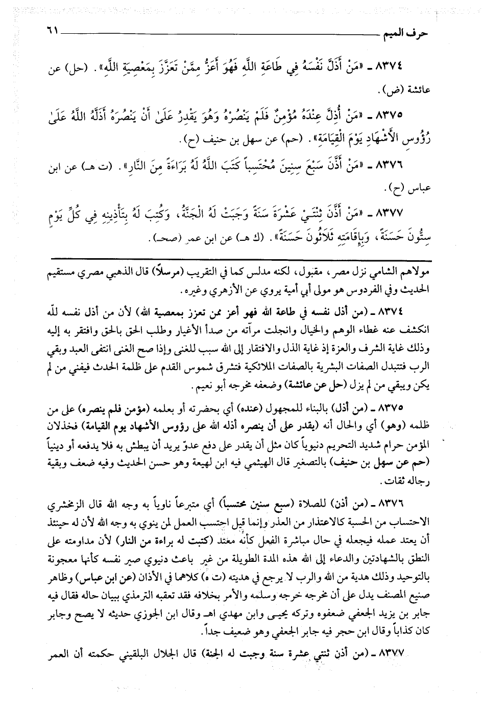 8375 - (من أذل) بالبناء للمجهول (عنده) أي بحضرته أو بعلمه (مؤمن فلم ينصره) على من ظلمه (هو) أي والحال أنه [ ص 47 ] (يقدر على أن ينصره أذله الله على رؤوس الأشهاد يوم القيامة) فخذلان المؤمن حرام شديد التحريم دنيويا كان مثل أن يقدر على دفع عدو يريد أن يبطش به فلا يدفعه أو دينيا.
