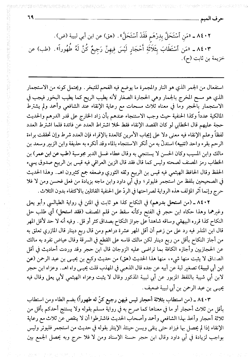 8403 - (من استطاب بثلاثة أحجار ليس فيهن رجيع كن له طهورا) بضم الطاء ومن استطاب بأقل من ثلاث أحجار أو ما في معناها كما صرح به في رواية مسلم بقوله ولا يستنج أحدكم بأقل من ثلاثة أحجار وأخذ بهذا الشافعي وأحمد وأصحاب الحديث فاشترطوا أن لا ينقص عن ثلاث مع رعاية الإنقاء إذا لم يحصل بها فيزاد حتى ينقى ويسن حينئذ الإيتار بقوله في حديث من استجمر فليوتر وليس بواجب لزيادة في أبي داود وقال ابن حجر : حسنة الإسناد ومن لا فلا حرج وبه يحصل الجمع بين