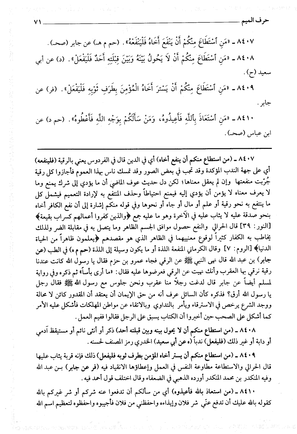 8407 - (من استطاع منكم أن ينفع أخاه) أي في الدين ، قال في الفردوس : يعني بالرقية (فلينفعه) أي على جهة الندب المؤكد وقد تجب في بعض الصور وقد تمسك ناس بهذا العموم فأجازوا كل رقية