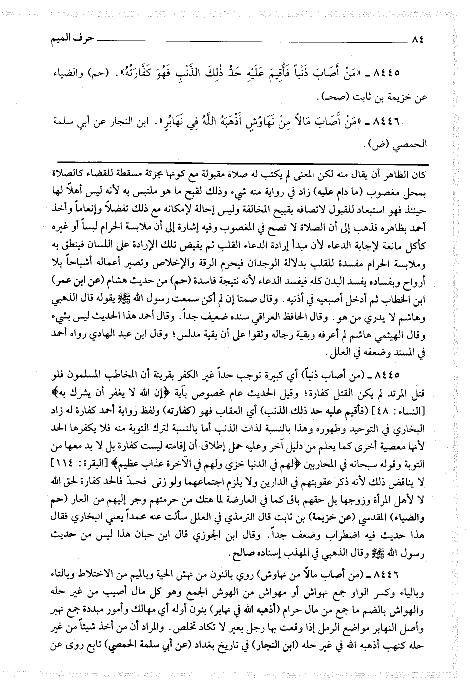 8446 - (من أصاب مالا من نهاوش) روي بالنون من نهش الحية وبالميم من الاختلاط وبالتاء وبالياء وكسر الواو جمع نهواش أو مهواش من الهوش الجمع وهو كل مال أصيب من غير حله ، والهواش بالضم ما جمع من مال حرام (أذهبه الله في نهابر) بنون أوله ، أي مهالك وأمور مبددة جمع نهبر ، وأصل النهابر مواضع الرمل إذا وقعت بها رجل بعير لا تكاد تخلص.