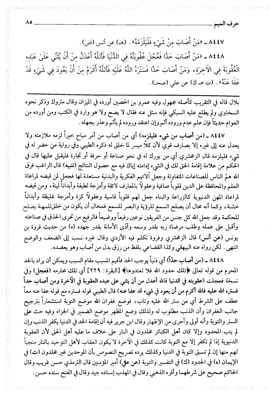 8448 - (من أصاب حدا) أي ذنبا يوجب الحد فأقيم المسبب مقام السبب ويمكن أن يراد بالحد المحرم من قوله تعالى * (تلك حدود الله فلا تعتدوها) [ البقرة : 229 ] أي تلك محارمه (فعجل) وفي نسخة فعجلت (عقوبته في الدنيا فالله أعدل من أن يثني على عبده العقوبة في الآخرة ومن أصاب حدا فستره الله عليه فالله أكرم من أن يعود في شئ قد عفا عنه) قال الطيبي : قوله فستره مع قوله عفا عنه معا عطف على الشرط أي من ستر الله عليه وتاب ، فوضع غفران الله موضع التوبة استشعارا بترجيح جانب الغفران وأن الذنب مطلوب له ولذلك وضع المظهر موضع الضمير في الجزاء ، وفيه حث على الستر والتوبة وأنه أولى وأحرى من الإظهار ، وقال ابن جرير : فيه أن إقامة الحد في الدنيا يكفر [ ص 66 ] الذنب وإن لم يتب المحدود وإلا كان أهل الكبائر مخلدون في النار على خلاف ما عليه أهل الحق لأن العقوبة الدنيوية إذا لم تكفر إلا مع التوبة كانت كذلك في الآخرة لا يكون العقاب لأهل التوحيد بالنار منجيا لهم منها إن لم تسبق التوبة في الدنيا وكذلك يرده تصريح النصوص بأن الموحدين غير مخلدون.
