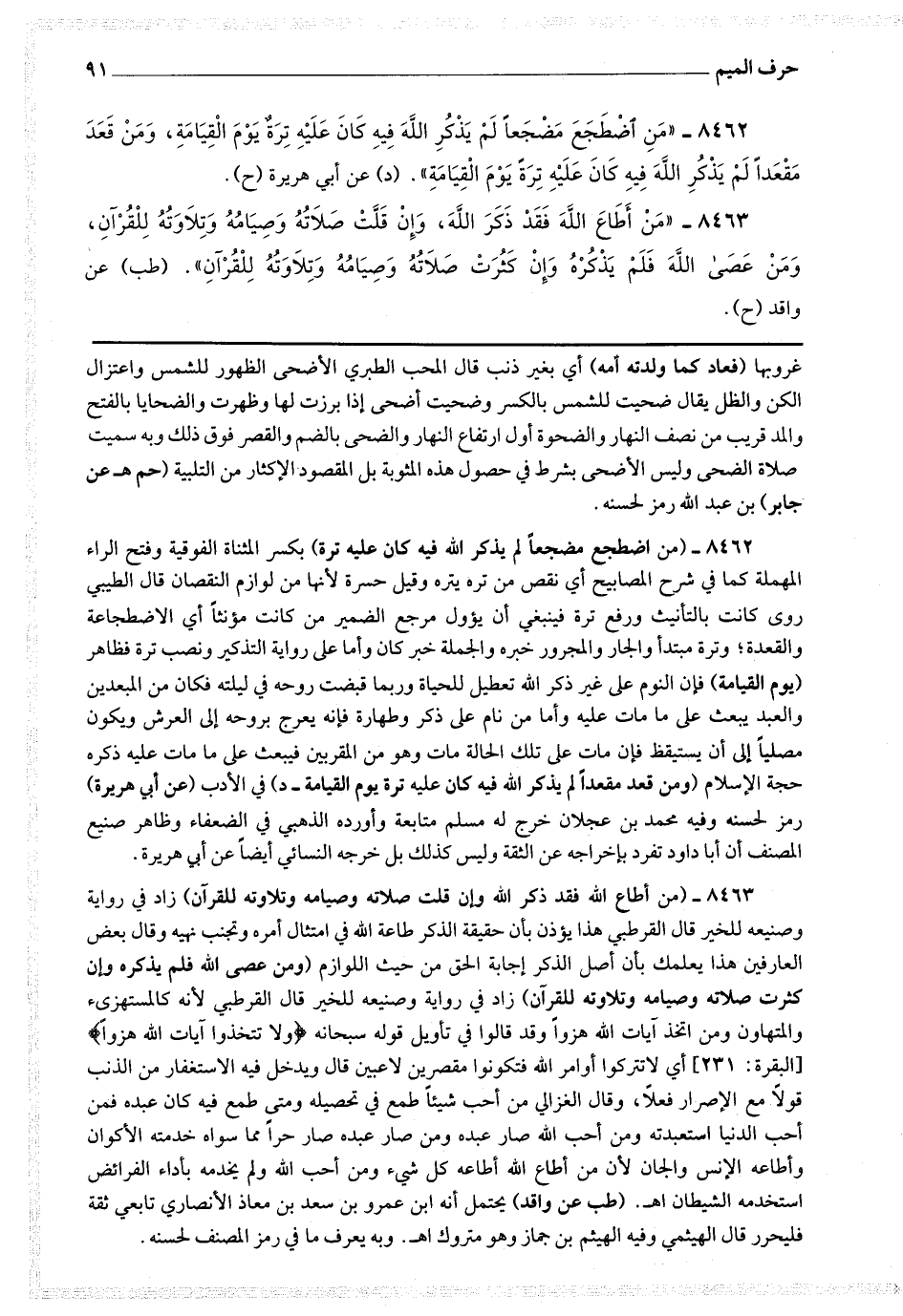 8462 - (من اضطجع مضجعا لم يذكر الله عليه كان عليه ترة) بكسر المثناة الفوقية وفتح الراء المهملة كما في شرح المصابيح أي نقص من تره يتره ، وقيل حسرة لأنها من لوازم النقصان ، قال الطيبي : روي كانت بالتأنيث ورفع ترة فينبغي أن يؤول مرجع الضمير من كانت مؤنثا أي الاضطجاعة والقعدة ، وترة مبتدأ والجار والمجرور خبره والجملة خبر كان ، وأما على رواية التذكير ونصب ترة فظاهر (يوم القيامة) فإن النوم على غير ذكر الله تعطيل للحياة وربما قبضت روحه في ليلته فكان من المبعدين والعبد يبعث على ما مات عليه وأما من نام على ذكر وطهارة فإنه يعرج بروحه إلى العرش ويكون مصليا إلى أن يستيقيظ فإن مات على تلك الحالة مات وهو من المقربين فيبعث على ما مات ذكره حجة الإسلام (ومن قعد مقعدا لم يذكر الله فيه كان عليه ترة يوم القيامة).