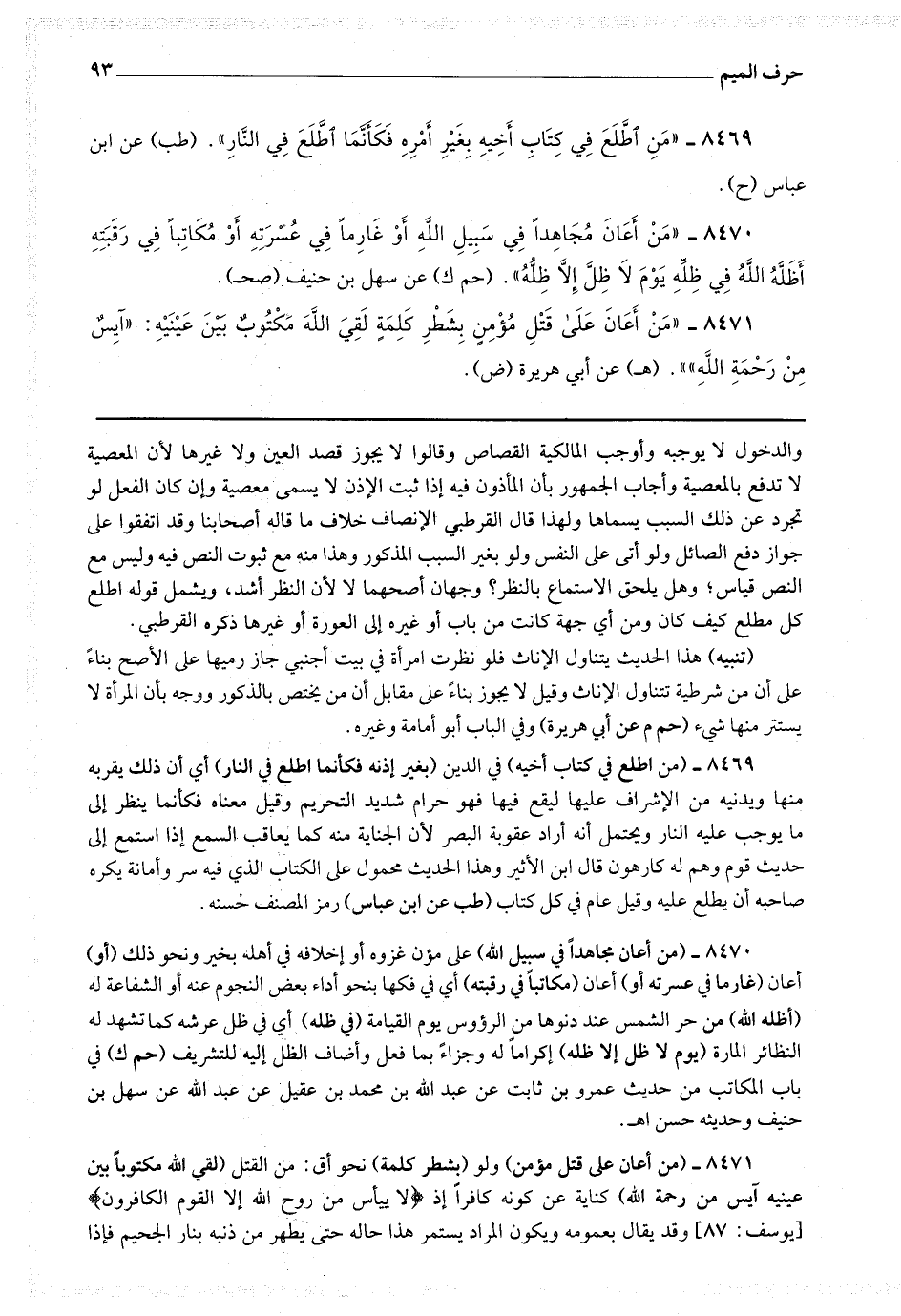 8469 - (من اطلع في كتاب أخيه) في الدين (بغير إذنه فكأنما اطلع في النار) أي أن ذلك يقربه منها ويدنيه من الإشراف عليها ليقع فيها فهو حرام شديد التحريم وقيل معناه فكأنما ينظر إلى ما يوجب عليه النار ، ويحتمل أنه أراد عقوبة البصر لأن الجناية منه كما يعاقب السمع إذا استمع إلى حديث قوم وهم له كارهون ، قال ابن الأثير : وهذا الحديث محمول على الكتاب الذي فيه سر وأمانة يكره صاحبه أن يطلع عليه وقيل عام في كل كتاب.
