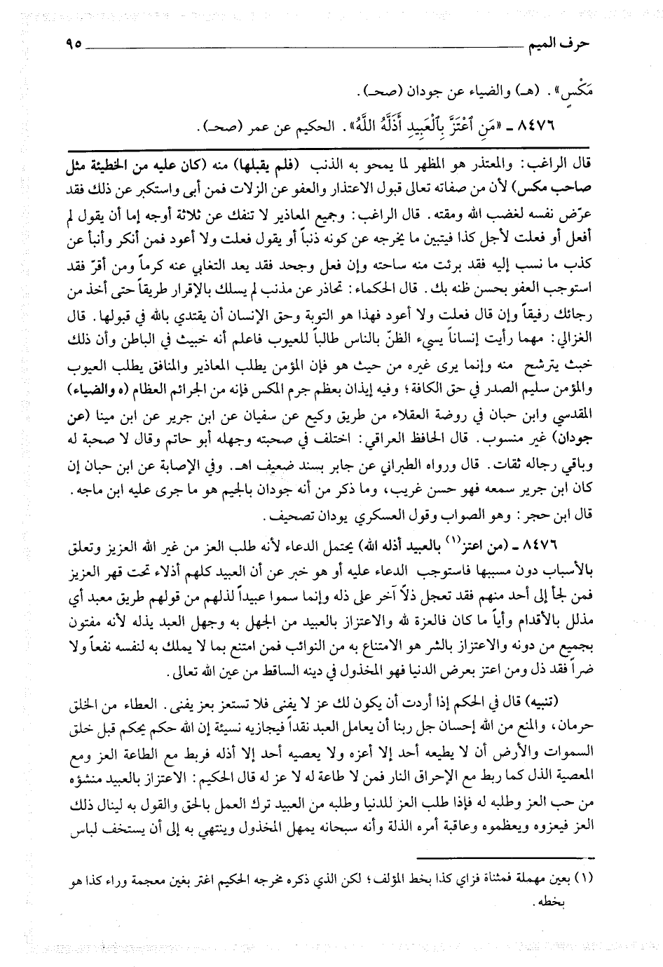 8476 - (من اعتز (1) بالعبيد أذله الله) يحتمل الدعاء لأنه طلب العز من غير الله العزيز وتعلق بالأسباب دون مسببها فاستوجب الدعاء عليه ، أو هو خبر عن أن العبيد كلهم أذلاء تحت قهر العزيز فمن لجأ إلى أحد منهم فقد تعجل ذلا آخر على ذله وإنما سموا عبيدا لذلهم من قولهم طريق معبد أي مذلل بالأقدام وأيا ما كان فالعزة لله والاعتزاز بالعبيد من الجهل به وجهل العبد يذله لأنه مفتون بجميع من دونه والاعتزاز بالشر هو الامتناع به من النوائب فمن امتنع بما لا يملك به لنفسه نفعا ولا ضرا فقد ذل ومن اعتز بعرض الدنيا فهو المخذول في دينه الساقط من عين الله.