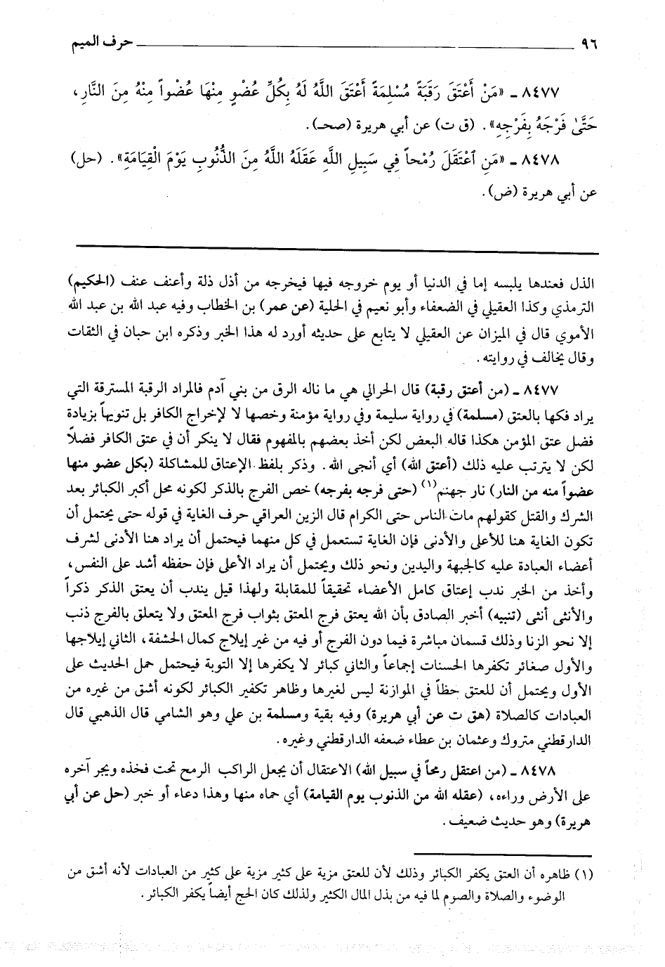 8477 - (من أعتق رقبة) قال الحرالي: هي ما ناله الرق من بني آدم فالمراد الرقبة المسترقة التي يراد فكها بالعتق (مسلمة) في رواية سليمة وفي وواية مؤمنة وخصها لا لإخراج الكافر بل تنويها بزيادة