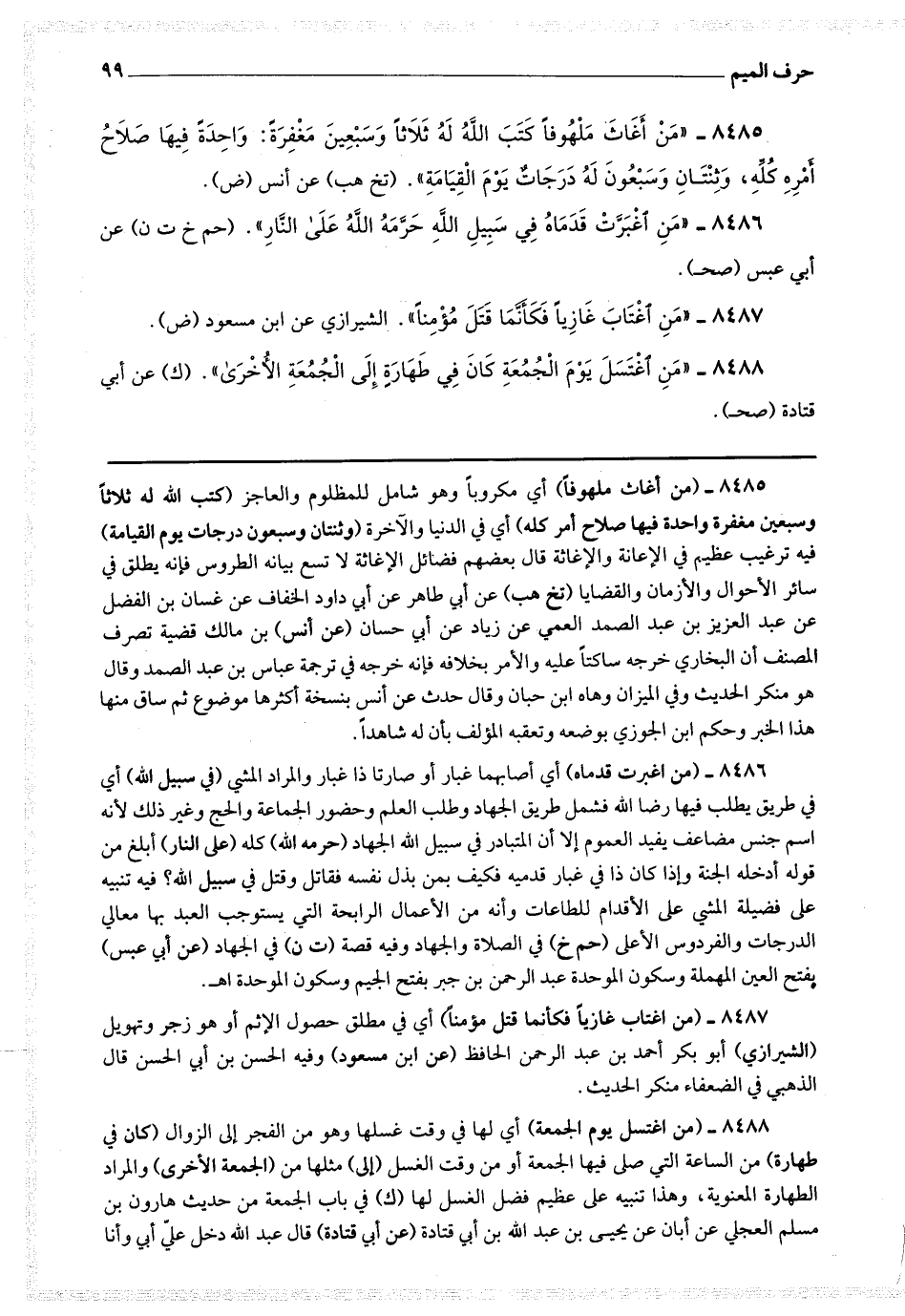 8486 - (من اغبرت قدماه) أي أصابهما غبار أو صارتا ذا غبار والمراد المشي (في سبيل الله) أي في طريق يطلب فيها رضا الله فشمل طريق الجهاد وطلب العلم وحضور الجماعة والحج وغير ذلك لأنه اسم جنس مضاعف يفيد العموم إلا أن المتبادر في سبيل الله الجهاد (حرمه الله) كله (على النار) أبلغ من قوله أدخله الجنة وإذا كان ذا في غبار قدميه فكيف بمن بذل نفسه فقاتل وقتل في سبيل الله ؟ فيه تنبيه على فضيلة المشي على الأقدام للطاعات وأنه من الأعمال الرابحة التي يستوجب العبد بها معالي الدرجات والفردوس الأعلى.