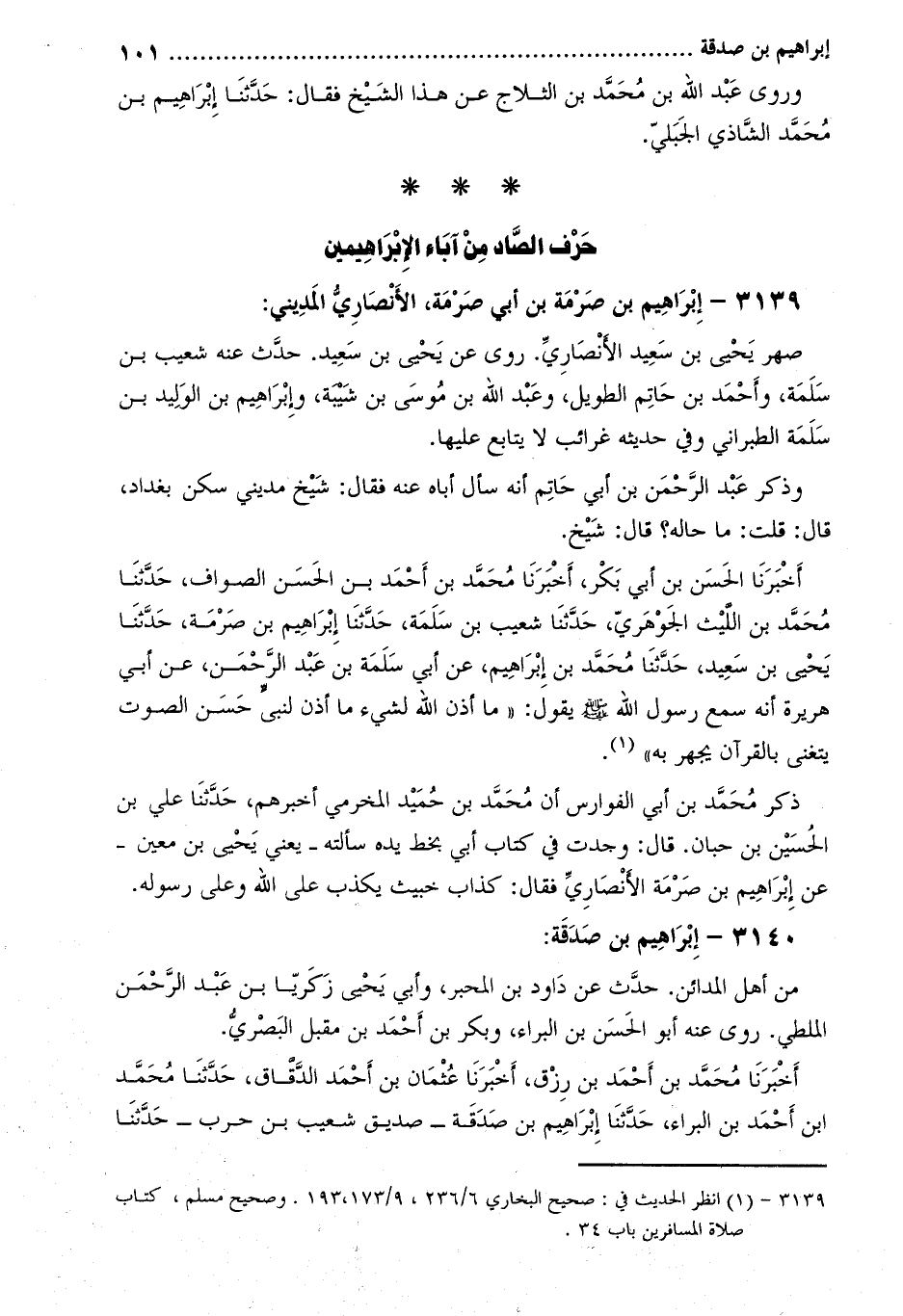 أَخْبَرَنَا الْحَسَنُ بْنُ أَبِي بكر، أخبرنا محمد بن أحمد بن الحسن الصواف، حدّثنا محمّد بن اللّيث الجوهريّ، حدّثنا شعيب بن سلمة، حدّثنا إبراهيم بن صرمة، حدّثنا يحيى بن سعيد، حَدَّثَنَا مُحَمَّدُ بْنُ إِبْرَاهِيمَ، عَنْ أَبِي سَلَمَةَ بْنِ عَبْدِ الرَّحْمَنِ، عَنْ أَبِي هُرَيْرَةَ أَنَّهُ سَمِعَ رَسُولَ اللَّهِ صَلَّى اللَّهُ عَلَيْهِ وَسَلَّمَ يَقُولُ: «مَا أَذِنَ اللَّهُ لِشَيْءٍ مَا أَذَنَ لِنَبِيٍّ حَسَنِ الصَّوْتِ يَتَغَنَّى بِالْقُرْآنِ يَجْهَرُ بِهِ» [1]