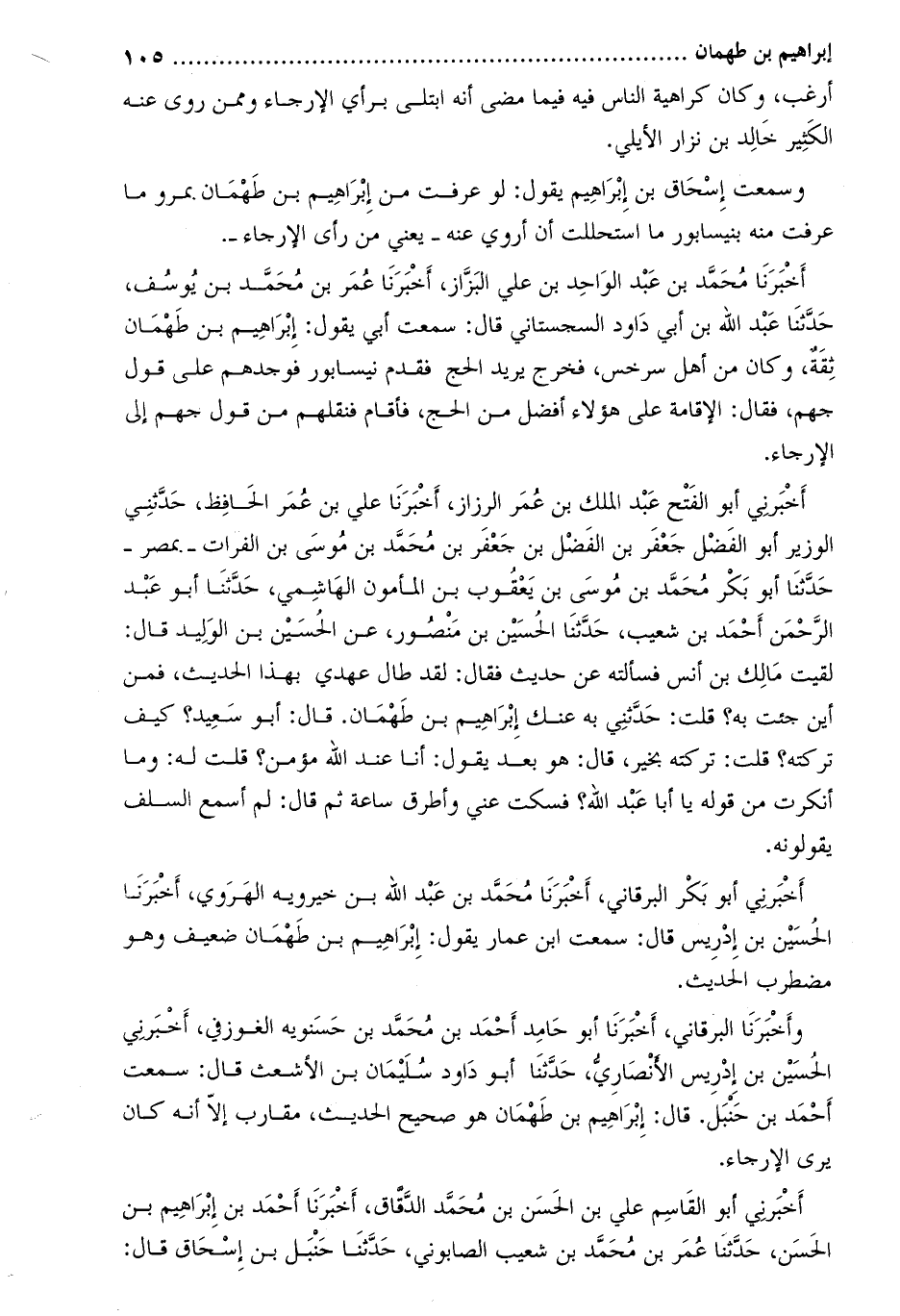 وسمعت إسحاق بن إبراهيم يقول: لو عرفت من إبراهيم بن طهمان بمرو ما عرفت منه بنيسابور ما استحللت أن أروي عنه- يعني من رأي الإرجاء-.